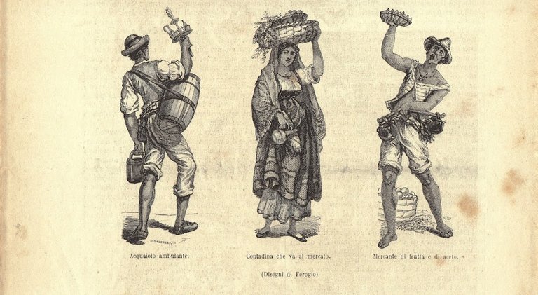 Napoli: acquaiolo ambulante, contadina che va al mercato, mercante di frutta. Stampa 1863.