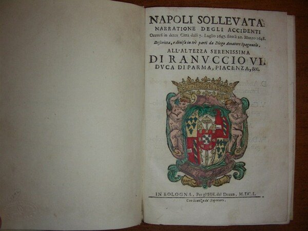 in-4, pp. 152, bella leg. p. perg. coeva con tit. oro al d. Tagli spruzzati. Gr. stemma di Napoli al front. con coloritura coeva. Opera dedicata a Ranuccio VI Duca di Parma. Manca la tavola fuori testo che doveva essere inserita tra le pagine 8 e 9, allegata in fotocopia. Lozzi 3025: “Raro”. Manca a Fera e Coleti. Mazzucchelli I, p. 599. Piantanida 883. Belliss. esempl., estremamente raro. [270]