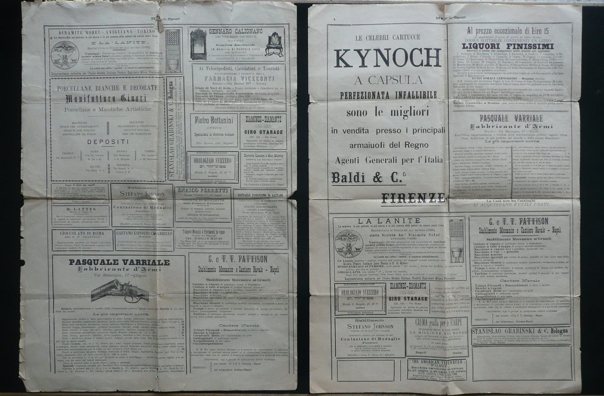 Settimanale, Napoli Sport" Rassegna settimanale illustrata Anno II - Numeri 43 e 71 1896 Stab. Tip. Salvati, Napoli 1896, cm 54x38,5, pp. 4 (bifolio); due numeri completi. Condizioni di conservazione Esemplari entrambi complessivamente in buone condizioni con tracce d'uso, normali pieghe di conservazione, margini e angoli con alcuni strappetti e qualche piccola circoscritta mancanza; pieghe di conservazione e alcuni incroci delle pieghe con strappetti anche di qualche cm e piccole mancanze che coinvolgono qualche carattere senza impedire la comprensione del testo, alcune delle quali oggetto di vecchio restauro con nastro adesivo. Due numeri completi. SC03.D10089 N "