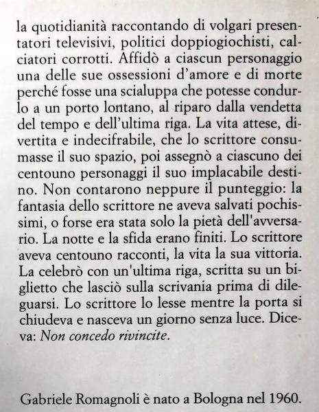 Soggetti: Letteratura italiana, Narrativa contemporanea, Racconti, La traversata del capitano Solo, Pepe stazione dopo stazione, Lettura, Morte, Vita, Tempesta, Bestsellers, Libri Vintage, Fuori catalogo, Dottor Adesso, Fuga da Carlo, La vita sbagliata di Kurt, Miraggi nel bosco, Cronache della sera, Brucia, Gianni, brucia, Dalle tre al tramonto, L’ultima pagina, Classici, Surrealismo, Romanzi brillanti brevi, Pantelleria, Antologie letterarie, Raccolte, Ironia, Pillole, Esordio, Anni Ottanta, Prime edizioni, Libri rari e introvabili, Microracconti, Opere letterarie, Giornalisti italiani del XXI secolo, Storie, Italian literature, Contemporary fiction, Short stories, Captain Solo's crossing, Pepe station after station, Reading, Death, Life, Storm, Out of print books, Classics, Surrealism, Short brilliant novels, Literary anthologies, Collections, Irony, Pills, Debut, Eighties, First editions, Rare and nowhere to be found books, Short stories, Literary works, Italian journalists of the 21st century