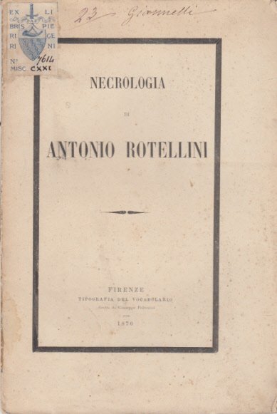 In-8 (Cm 23 x 15,5), pp.15, brossura editoriale. Ex libris Pieri Gerini. Brossura con qualche piccola macchiolina e firma di possesso. Ordinari segni del tempo. BUONO - Antonio Rotellini nato a Castel Del Piano da Domenico Rotellini e Maria Bruchi il 22 febbraio 1811. Sposo' nel 1848 la signora Teresa Fraticelli di Sarteno.