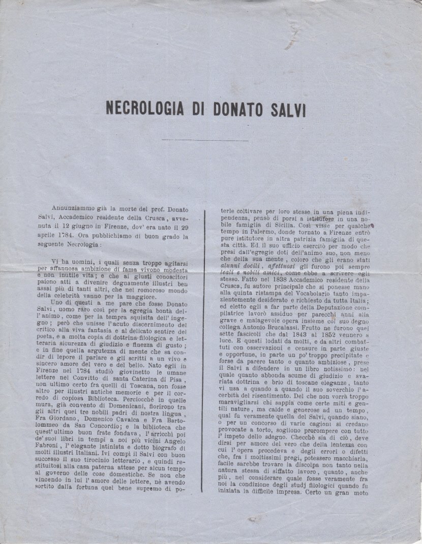 In-8 (Cm 27 x 21), due carte una delle quali scritta fronte e retro. Ex libris Pieri Gerini. Piccolo strappetto margine alto e pieghetta centrale. Estratto dalla GAzzetta di Firenze n. 186 del 5 Agosto 1864. BUONO - Donato Salvi fu accademico residente della Crusca. Nacque a Firenze nel 1784, visse qualche tempo a Palermo come istitutore in una famiglia e successivamente sercito' la stessa professione a Firenze. Nel 1883 fu fatto accademico residente della Cruscae si occupo' della quinta ristampa del Vovabolario.