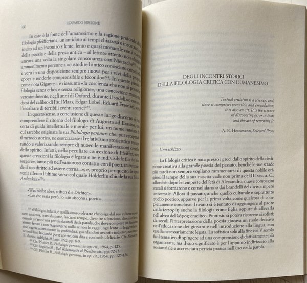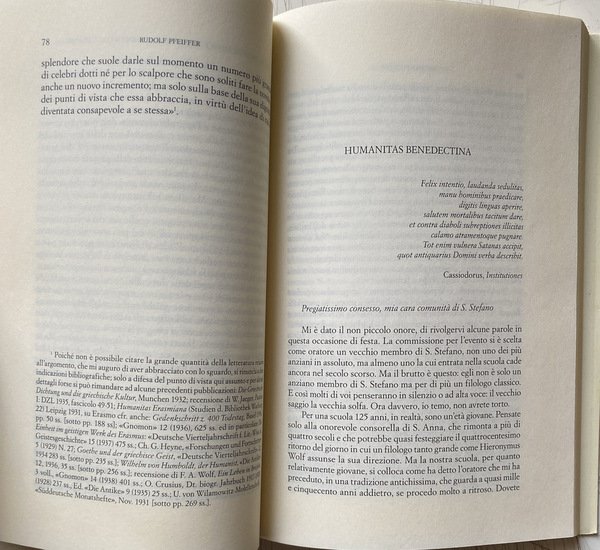 He's the symbol of a Philology conceived as sinolo of religious sentiment, humanism and science critique which remains through a "subliminally flowing stream of cultural unity of European history", including Pfeiffer's historically conscious, ranging from the age of Callimachus, the first Kulturbewahrer, al circolo degli Scipioni, then up to Spatantike and the Christian Middle Ages, then to the Renaissance and from there to the modern world and contemporary.
