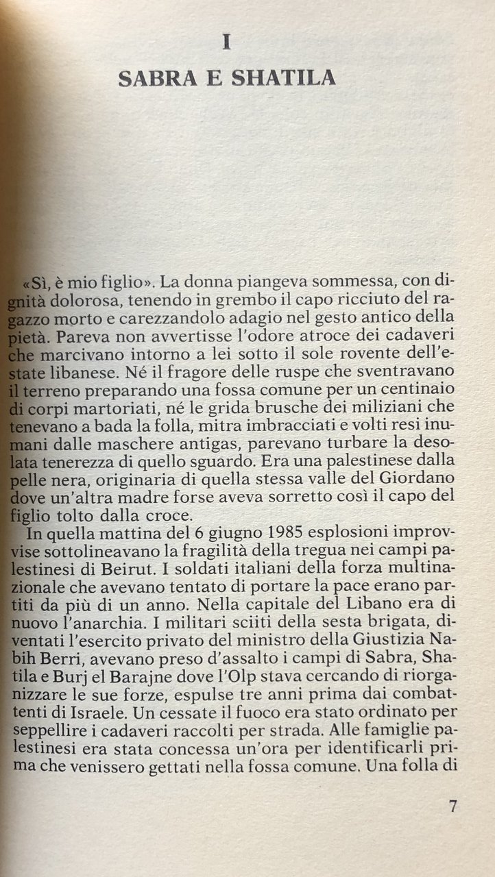 Soggetti: Storia contemporanea Novecento Reportage Medio Oriente Libano Terrorismo Geopolitica Israele Conflitti Guerre Conflitto israelo-palestinese Palestina Islam Mondo Arabo Anni Settanta Anni Ottanta Libri Vintage Fuori catalogo Beirut Rifugiati politici Campi profughi Religioni Cristianesimo Terroristi Cristiani Convivenza Gheddafi Intervento israeliano Strage di Sabra e Chatila Stragi Eccidi di massa Yasser Arafat Saggistica OLP Soldati italiani ONU El Barajine Militari Pace Massacri 1982 1985 Giornalismo Inchieste Testimonianze Attentati Autobus Odio Fanatismo NATO Organizzazioni internazionali Politica estera Ronald Reagan Falangi Sciti Guerra civile libanese Begin Habib Bashir Gemayel Ariel Sharon Milizie cristiano-falangiste Elie Hobeika Stadio Citè Sportive Robert Fisk Commissione Kahan Contemporary History Twentieth Century Middle East Lebanon Terrorism Geopolitics Israel Conflicts Wars Israeli-Palestinian Conflict Palestine Arab World Seventies Eighties Books Out of Print Political Refugees Refugee Camps Religions Christianity Terrorists Christians Cohabitation Israeli Intervention Massacre of Sabra and Chatila Mass killings Non-fiction Italian soldiers Military Peace Journalism Investigations Testimonials Attacks Buses Hate Fanaticism International Organizations Foreign Policy Phalanges Scythians Lebanese Civil War Christian-Phalangist Militias Collectibles Collezionismo Diritti umani Attualità