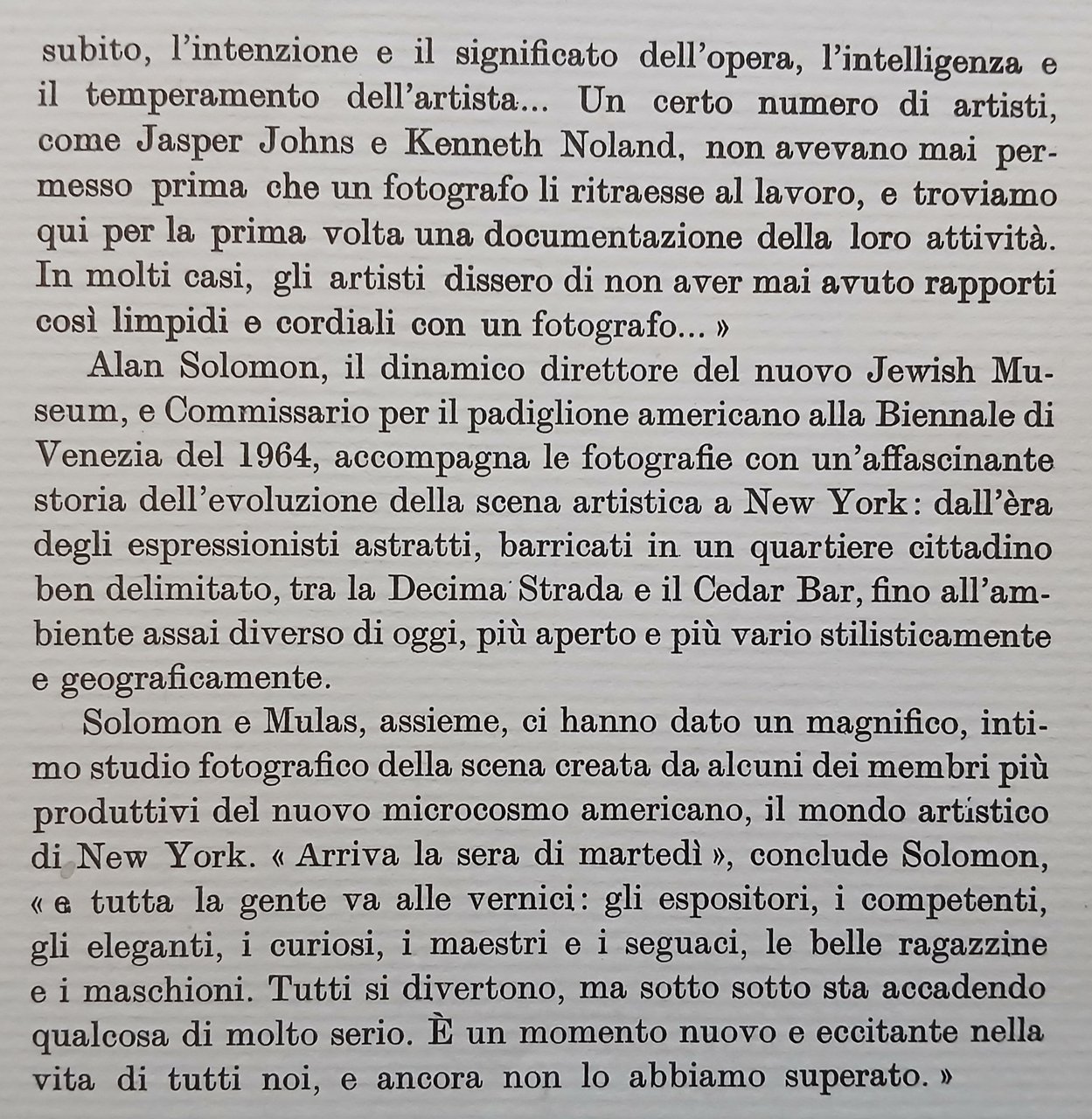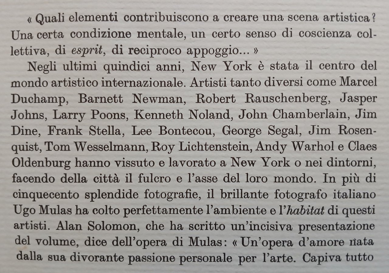 In 4°, legatura editoriale in piena tela con sovraccoperta illustrata, pp. 337,(7) quasi interamente illustrate dalle fotografie in bianco e nero di Ugo Mulas, scattate negli anni Sessanta e che ritraggono i protagonisti della scena artistica newyorkese. Collana "I Marmi", volume 47. Edizione originale. Stato di conservazione molto buono.