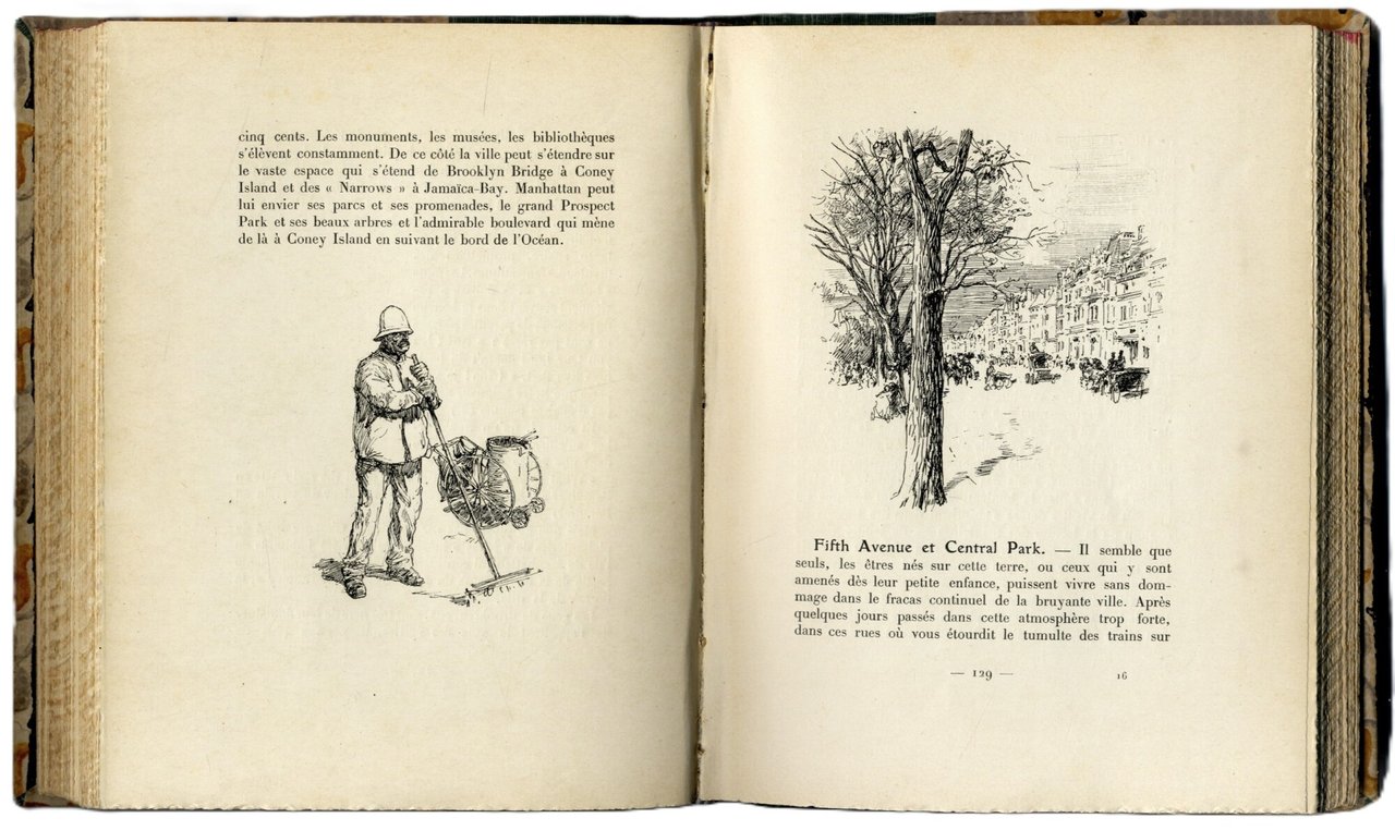 >in-8, pp. 202, (2), con numerose illustrazioni in nero n.t. e f.t., Leg. in m. tela edit., piatti in cartone decorato, titolo in oro su tassello al dorso, brossura edit. conservata. Edizione originale, impressa su carta forte. Volume dedicato alla New York di inizio secolo e ben illustrato con decine di vedute e scene neworkesi, tra vignette e tavole f.t. L'A. fu pittore ed incisore francese, molto noto principalmente per aver illustrato le opere di Balzac, oltre alla presente. Ottimo esemplare.