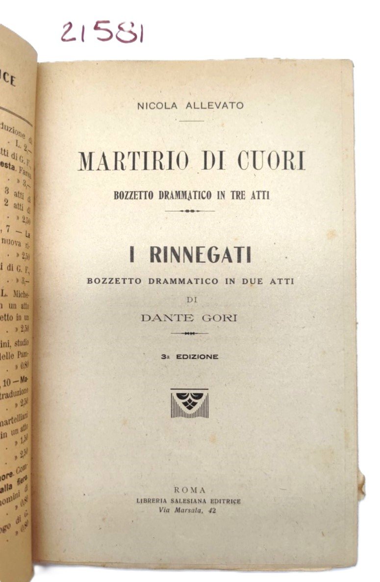 Nuova collana drammatica maschile Nicola Allevato Martirio di cuori bozzetto drammatico e tre atti e Rinnegati bozzetto drammatico in due atti di Dante Gori 3° edizione Libreria Salesiana