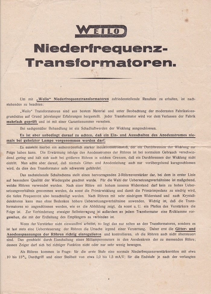 Der historische Prospekt im größeren Blattformat enthält Texte und mehrere Abbildungen zu verschiedenen Modellen der Marke Weilo. Vorgestellt werden u.a. die Weilo-Modelle 3, der "Weilo-Champion" Modell 10 und die "kleine Type" Weilo Modell 5. Enthalten ist auch ein "Neues Schaltschema für 2-Röhrenverstärker". Seltener Prospekt für Transformatorentechnik vor 1945!