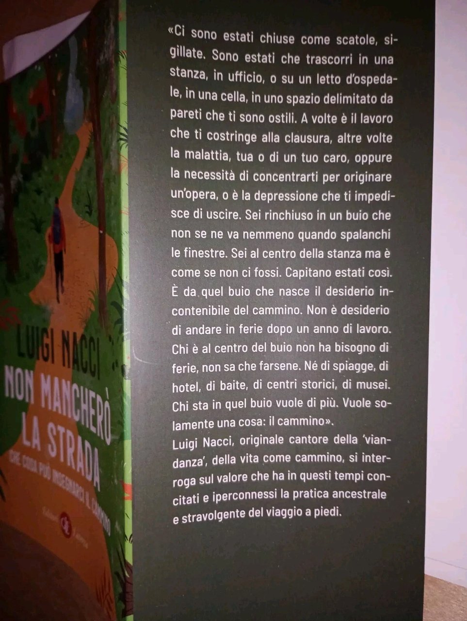 Ci sono estati chiuse come scatole, sigillate. Sono estati che trascorri in una stanza, in ufficio, o su un letto d'ospedale, in una cella, in uno spazio delimitato da pareti che ti sono ostili. A volte è il lavoro che ti costringe alla clausura, altre volte la malattia, tua o di un tuo caro, oppure la necessità di concentrarti per originare un'opera, o è la depressione che ti impedisce di uscire. Sei rinchiuso in un buio che non se ne va nemmeno quando spalanchi le finestre. Sei al centro della stanza ma è come se non ci fossi. Capitano estati così. È da quel buio che nasce il desiderio incontenibile del cammino. Non è desiderio di andare in ferie dopo un anno di lavoro. Chi è al centro del buio non ha bisogno di ferie, non sa che farsene. Né di spiagge, di hotel, di baite, di centri storici, di musei. Chi sta in quel buio vuole di più. Vuole solamente una cosa: il cammino».