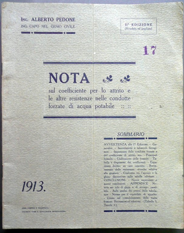 Pedone ing. Alberto, Nota sul coefficiente per lo attrito e le altre resitenze nelle condotte forzate di acqua potabile" Stabilimento Artistico Industr. Modiano&C., Milano, 1913; 28,5x22,8 cm., 52 pp.+5 tavv. a colori rip. pi√π volte, br. ed., dedica autografa a penna al frontespizio. Condizioni di conservazione Esemplare in buonissime condizioni con minime tracce d'uso alla br. ed., leggere slabbrature ai margini, pieghette agli angoli, alcune macchiette ai piatti, interni molto buoni, freschi, rare macchiette e bruniture, uno strappetto alla tav. n. 3, piega verticale di precedente conservazione presente in tutto il documento. SC03.D4558 MT "
