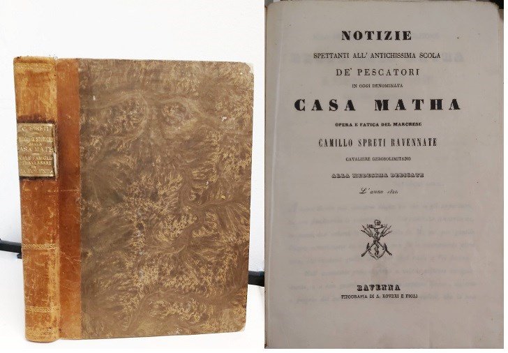 2 parti in un vol. in-4 gr., pp. (8), 294, (2), 230, (4), leg. m. pelle coeva con tass. e tit. oro al d. Ritr. dell'A. in antip. inc. da G. Nanni su dis. di F. Nistri. La prima parte è dedicata all'origine e denominazione della scola de' pescatori e la seconda raccoglie "gli statuti e rubriche dell'ordine della Casa-Matha dal 1304. 1308, le matricole. cominciando dall'anno 1305". E' la storia della gloriosa istituzione di Ravenna, corporazione che risale al IX sec. e che forse può definirsi la più antica società del mondo. Lozzi 462 e 3933: "Il catalogo Bocca cita un'edizione del 1839?". Probabilmente l'edizione citata dal Bocca e riferita dal Lozzi è questa da noi posseduta poiché al fine nell'imprimatur compare la data 1839. Raro. Picc. dif. alla cuffia sup. ma belliss. esempl. a larghi margini. 506/5