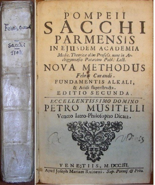 NOVA METHODUS FEBRIS CURANDI. Fundamentis Alkali, & Acidi superstructa. Editio secunda. Venezia, Ruinetti, 1703. Segue: Idem. IRIS FEBRILIS FOEDUS INTER ANTIQUORUM & Recentiorum Opiniones de Febribus promittens.