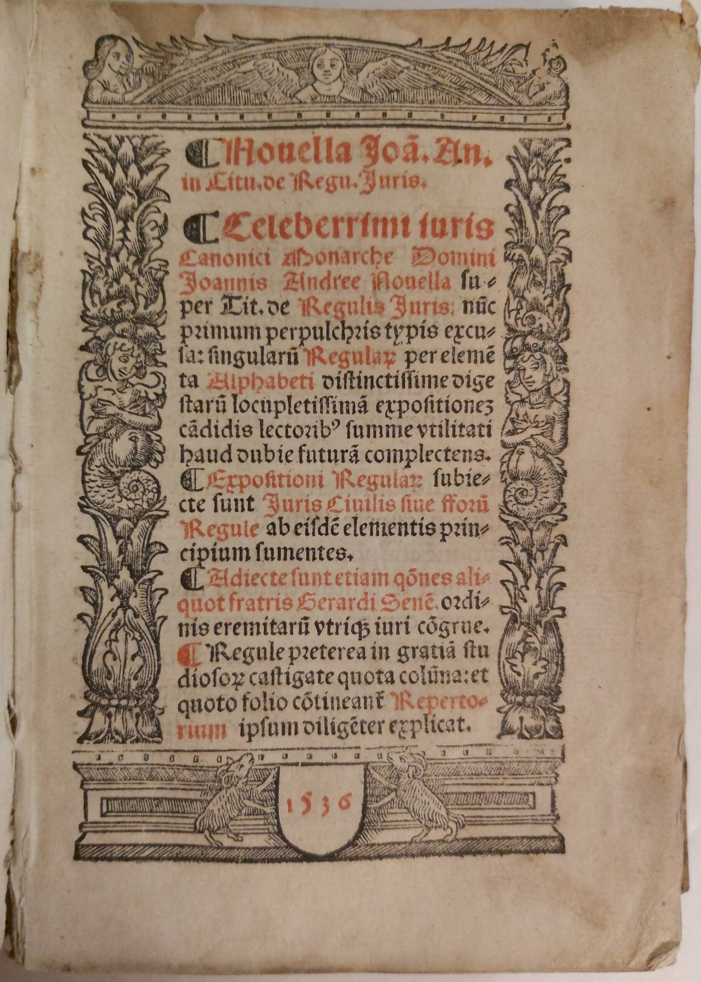 NOVELLA SUPER TIT. DE REGULIS JURIS nu[n]c primum perpulchris typis excusa : singularu[m] regula[rum] per eleme[n]ta alphabeti distinctissime digestaru[m] locupletissimã expositionez ca[n]didis lectorib[us] summe utilitati haud dubie futura[m] complectens . adiecte sunt etiam qo[n]nes aliquot fratris Gerardi Sene[m], ordinis eremitarum utriq[ue] iuri co[n]grue.