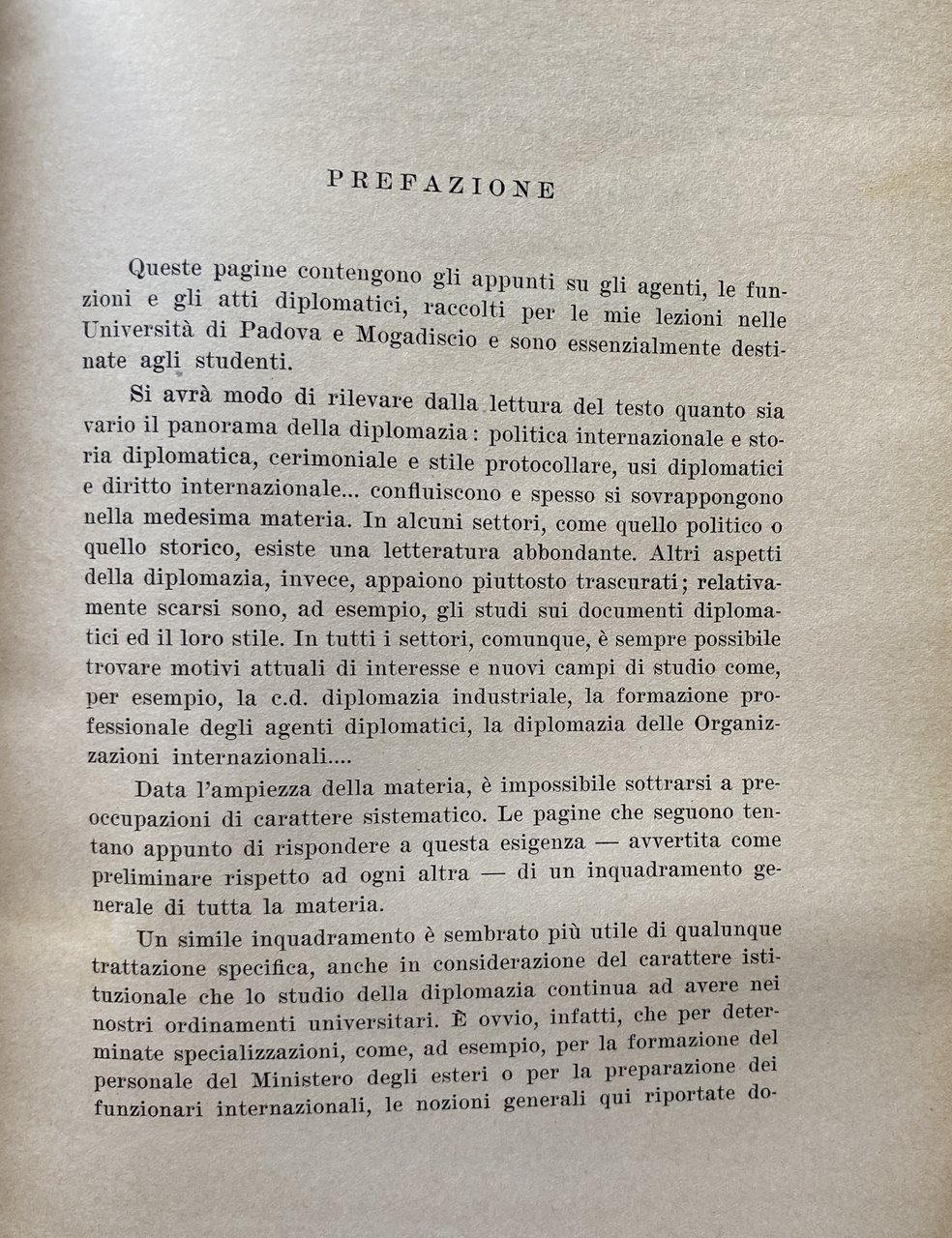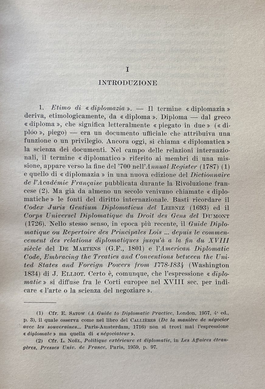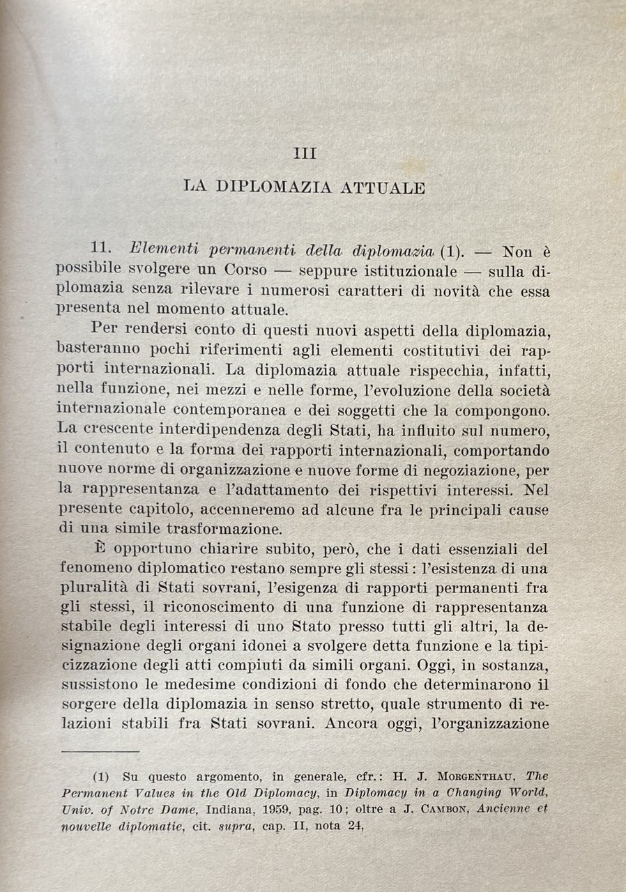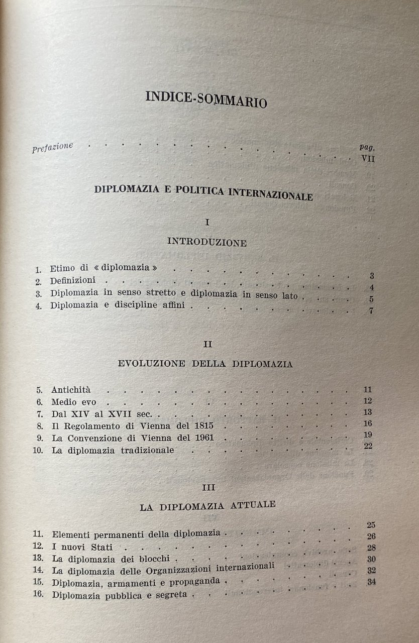 PREFAZIONE. Queste pagine contengono gli appunti su gli agenti, le funzioni e gli atti diplomatici, raccolti per le mie lezioni nelle Università di Padova e Mogadiscio e sono essenzialmente destinate agli studenti. Si avrà modo di rilevare dalla lettura del testo quanto sia vario il panorama della diplomazia: politica internazionale e storia diplomatica, cerimoniale e stile protocollare, usi diplomatici e diritto internazionale confluiscono e spesso si sovrappongono nella medesima materia. In alcuni settori, come quello politico o quello storico, esiste una letteratura abbondante. Altri aspetti della diplomazia, invece, appaiono piuttosto trascurati; relativamente scarsi sono, ad esempio, gli studi sui documenti diplomatici ed il loro stile. In tutti i settori, comunque, è sempre possibile trovare motivi attuali di interesse e nuovi campi di studio come, per esempio, la c.d. diplomazia industriale, la formazione professionale degli agenti diplomatici, la diplomazia delle Organizzazioni internazionali. Data l'ampiezza della materia, è impossibile sottrarsi a preoccupazioni di carattere sistematico. Le pagine che seguono tentano appunto di rispondere a questa esigenza avvertita come preliminare rispetto ad ogni altra, di un inquadramento generale di tutta la materia. Un simile inquadramento è sembrato più utile di qualunque trattazione specifica, anche in considerazione del carattere istituzionale che lo studio della diplomazia continua ad avere nei nostri ordinamenti universitari. È ovvio, infatti, che per determinate specializzazioni, come, ad esempio, per la formazione del personale del Ministero degli esteri o per la preparazione dei funzionari internazionali, le nozioni generali qui riportate dovrebbero essere integrate da uno studio più specifico dei singoli argomenti, in funzione di ciascuna specializzazione. Nel confidare questi miei appunti alle stampe, tengo ad esprimere la mia affettuosa gratitudine a Msgr. A. M. BETTANINI. Venezia, aprile 1962.