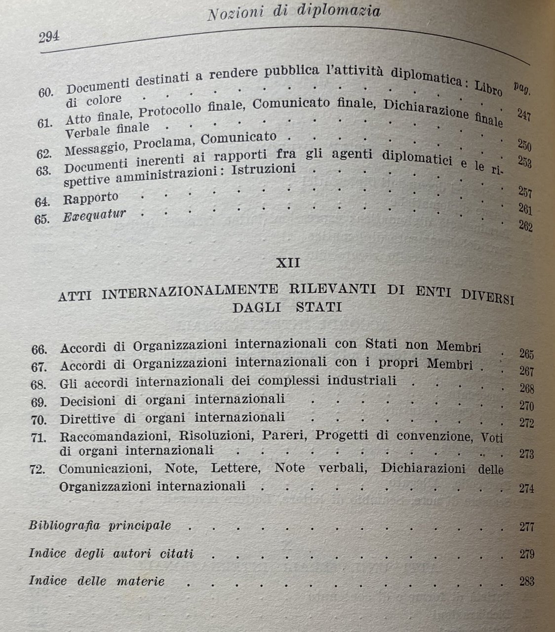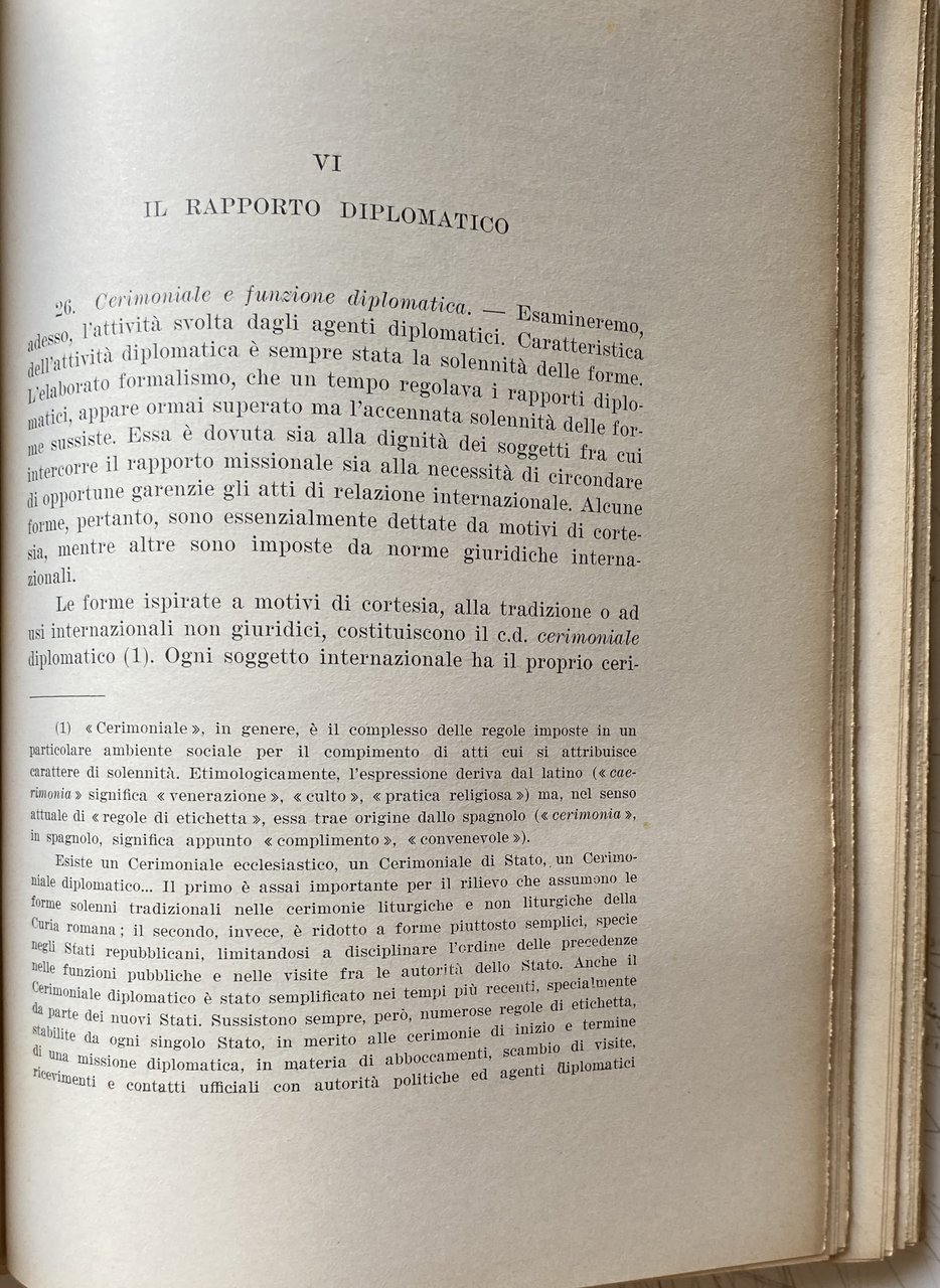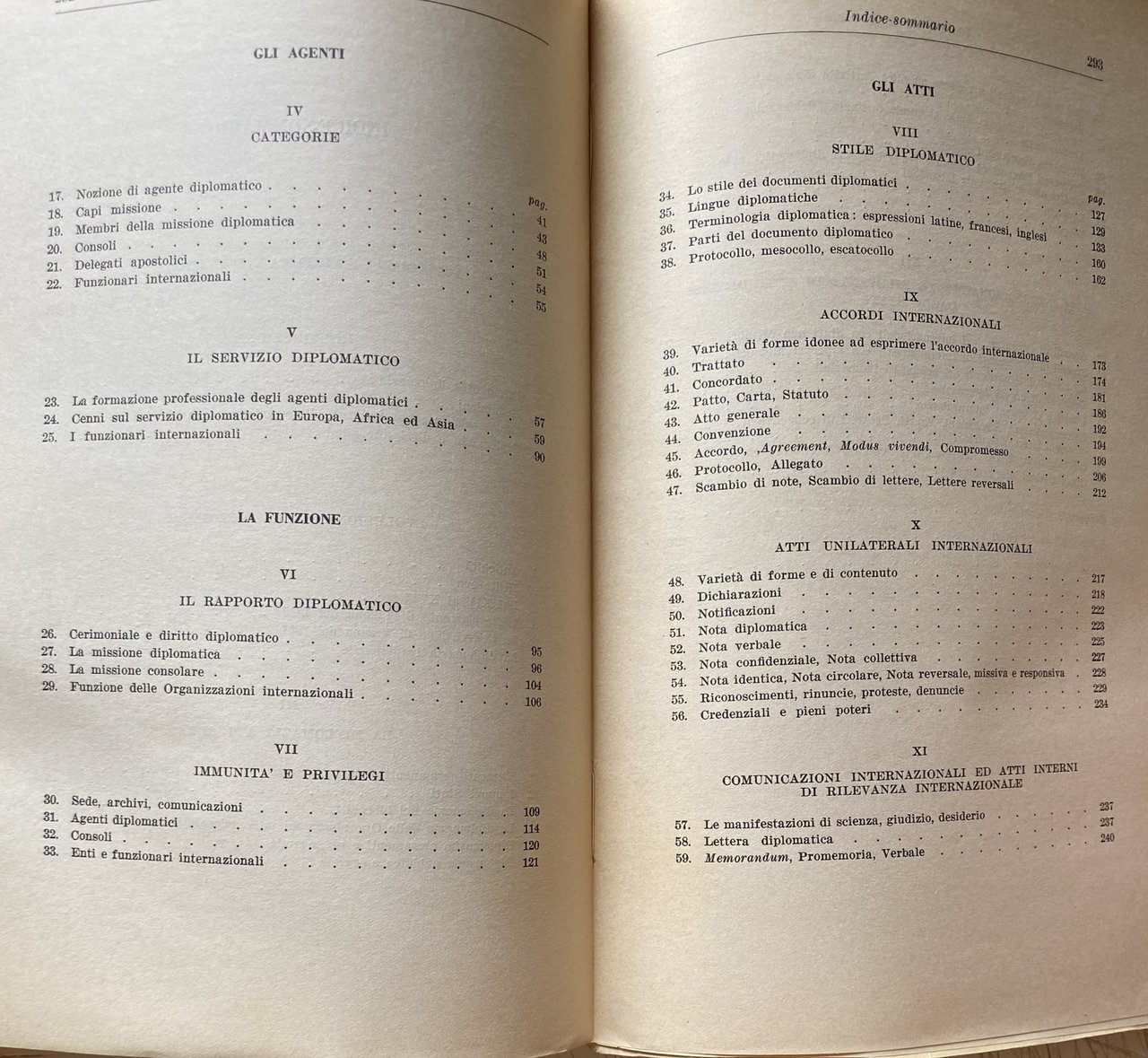 PREFAZIONE. Queste pagine contengono gli appunti su gli agenti, le funzioni e gli atti diplomatici, raccolti per le mie lezioni nelle Università di Padova e Mogadiscio e sono essenzialmente destinate agli studenti. Si avrà modo di rilevare dalla lettura del testo quanto sia vario il panorama della diplomazia: politica internazionale e storia diplomatica, cerimoniale e stile protocollare, usi diplomatici e diritto internazionale confluiscono e spesso si sovrappongono nella medesima materia. In alcuni settori, come quello politico o quello storico, esiste una letteratura abbondante. Altri aspetti della diplomazia, invece, appaiono piuttosto trascurati; relativamente scarsi sono, ad esempio, gli studi sui documenti diplomatici ed il loro stile. In tutti i settori, comunque, è sempre possibile trovare motivi attuali di interesse e nuovi campi di studio come, per esempio, la c.d. diplomazia industriale, la formazione professionale degli agenti diplomatici, la diplomazia delle Organizzazioni internazionali. Data l'ampiezza della materia, è impossibile sottrarsi a preoccupazioni di carattere sistematico. Le pagine che seguono tentano appunto di rispondere a questa esigenza avvertita come preliminare rispetto ad ogni altra, di un inquadramento generale di tutta la materia. Un simile inquadramento è sembrato più utile di qualunque trattazione specifica, anche in considerazione del carattere istituzionale che lo studio della diplomazia continua ad avere nei nostri ordinamenti universitari. È ovvio, infatti, che per determinate specializzazioni, come, ad esempio, per la formazione del personale del Ministero degli esteri o per la preparazione dei funzionari internazionali, le nozioni generali qui riportate dovrebbero essere integrate da uno studio più specifico dei singoli argomenti, in funzione di ciascuna specializzazione. Nel confidare questi miei appunti alle stampe, tengo ad esprimere la mia affettuosa gratitudine a Msgr. A. M. BETTANINI. Venezia, aprile 1962.