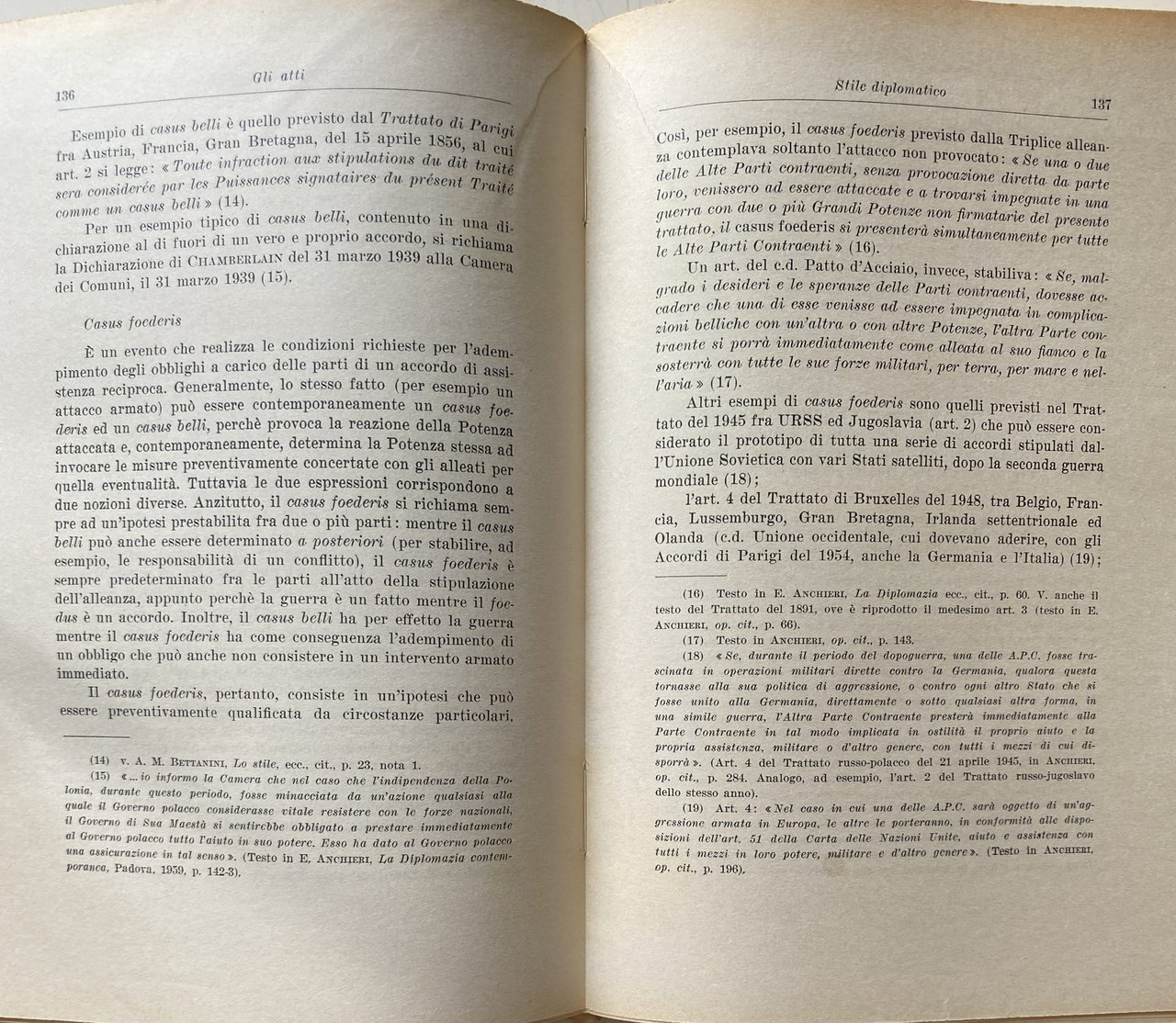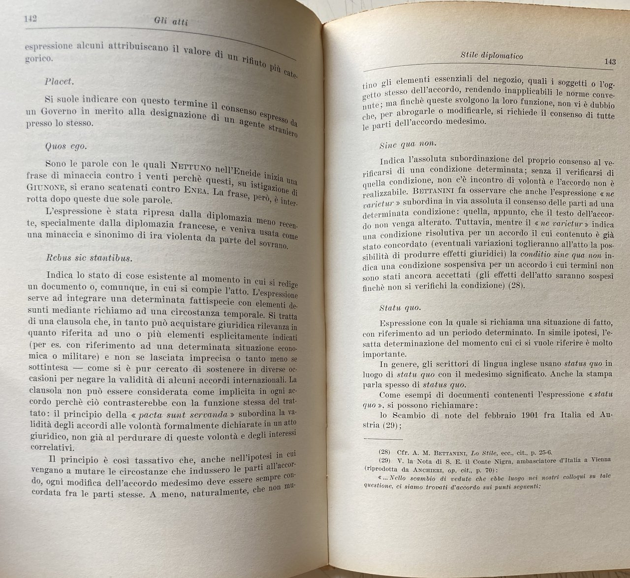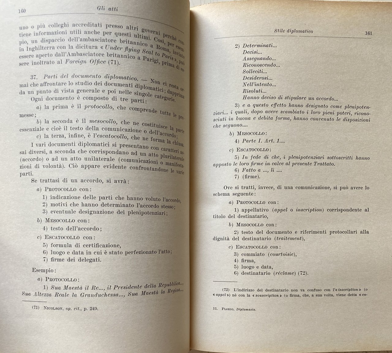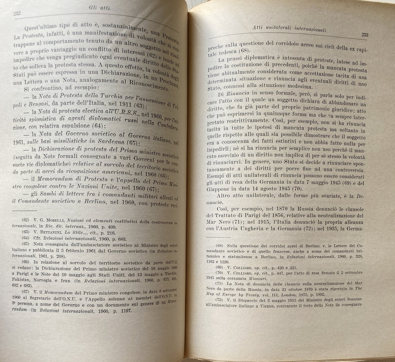 PREFAZIONE. Queste pagine contengono gli appunti su gli agenti, le funzioni e gli atti diplomatici, raccolti per le mie lezioni nelle Università di Padova e Mogadiscio e sono essenzialmente destinate agli studenti. Si avrà modo di rilevare dalla lettura del testo quanto sia vario il panorama della diplomazia: politica internazionale e storia diplomatica, cerimoniale e stile protocollare, usi diplomatici e diritto internazionale confluiscono e spesso si sovrappongono nella medesima materia. In alcuni settori, come quello politico o quello storico, esiste una letteratura abbondante. Altri aspetti della diplomazia, invece, appaiono piuttosto trascurati; relativamente scarsi sono, ad esempio, gli studi sui documenti diplomatici ed il loro stile. In tutti i settori, comunque, è sempre possibile trovare motivi attuali di interesse e nuovi campi di studio come, per esempio, la c.d. diplomazia industriale, la formazione professionale degli agenti diplomatici, la diplomazia delle Organizzazioni internazionali. Data l'ampiezza della materia, è impossibile sottrarsi a preoccupazioni di carattere sistematico. Le pagine che seguono tentano appunto di rispondere a questa esigenza avvertita come preliminare rispetto ad ogni altra, di un inquadramento generale di tutta la materia. Un simile inquadramento è sembrato più utile di qualunque trattazione specifica, anche in considerazione del carattere istituzionale che lo studio della diplomazia continua ad avere nei nostri ordinamenti universitari. È ovvio, infatti, che per determinate specializzazioni, come, ad esempio, per la formazione del personale del Ministero degli esteri o per la preparazione dei funzionari internazionali, le nozioni generali qui riportate dovrebbero essere integrate da uno studio più specifico dei singoli argomenti, in funzione di ciascuna specializzazione. Nel confidare questi miei appunti alle stampe, tengo ad esprimere la mia affettuosa gratitudine a Msgr. A. M. BETTANINI. Venezia, aprile 1962.