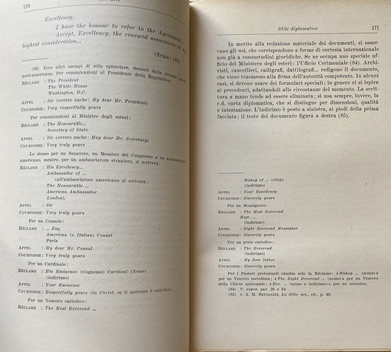 Soggetti: Diritto internazionale, Diritto diplomatico e consolare, Storia, Diplomazia pubblica e segreta, Relazioni internazionali, Plenipotenziari, Politica estera, Stati, Trattati, Accordi, Armamenti, Propaganda, Codificazioni, Manuali, Lezioni, Opere generali, Bibliografia, Riferimento, Consultazione, Collezionismo, Protocollo, Missione, Delegati, Organi, Consoli, Ambasciatori, Cerimoniale, Poteri, Immunità, Privilegi, Ambasciate, Consolati, Rappresentanza, Guerre, Diritti umani, Scienze politiche, Ius gentium, Armi convenzionali, Seconda Guerra mondiale, Mine, Croce Rossa, Protocolli, Convenzione di Ginevra, Anton M. Bettanini, Paul Couzinet, Droit international, Organizzazioni, Sovranità, Derecho Internacional, Relaciones Internacionales, Evoluzione, Categorie, Servizio diplomatico, Stile diplomatico, Atti unilaterali internazionali, Comunicazioni, Benedetto Conforti, Protezione, Personale, Prassi, Appunti, Note, Lezioni universitarie, Formazione professionale, Europa, Africa, Asia, America, Terminologia, Lingue, Protocollo, Escatocollo, Mesocollo, Patto, Carta, Statuto, Concordato, Trattato, Documenti, Scambio, Lettere, Richiamo, Notificazioni, Dichiarazioni, Proteste, Denunce, Nota, Pieni poteri, Memorandum, Verbale, Libro di colore, Membri, Pareri, Direttive, Decisioni, Libri rari Vintage fuori catalogo, Studio, Georg Schwarzenberger, Alto Commissariato, Nazioni Unite, Rifugiati, Classici ottocenteschi, Scrittura, Servizi segreti, Terrorismo, Guerra fredda, Teoria, Tecnica, Jose Sebastian De Erice Y O'Shea, Mario Giuliano, Adolfo Maresca, Santi Nava, Rubens Ferreira de Mello, Paolo Selmi, Heinrich Wildner, François de Callières, Ferdinand de Cornot Cussy, Vladimir P. Potemkin, Benjamin M. Chvostov, Paul Pradier-Fodéré, Abraham Van Wicquefort, Alberico Gentili, Inglese, Francese, De l'ambassadeur, De Legationibus, Baldassarre Castiglione, Mazzarino, Ministeri, Memorialistica, Ettore Anchieri, Giorgio Balladore Pallieri, J. Cambon, Le Fur, H. Nicolson, Hans Morgenthau, Giuseppe Mazzini, G. De Mably, Pannikar, Egido Puente, Luigi Salvatorelli, J.J. Santa Pinter, K. Strupp, C. Thayer, Max Weber, Ad Interim, Donne, Carriera diplomatica, Residenza, Libertà, Movimento, Accreditamento, Asilo politico, Blue Books, Bandiera, Blocchi, Casus Belli, Criptologia, Delfino, Guerre, Pace, Negoziati, Fin de non recevoir, Familiari, Titoli, Eccellenza, Eminenza, Grand titre, Gradimento, Nozioni, Lineamenti, Kronprinz, Niccolò Machiavelli, Lingue, Inviati, Credenziali, Inviolabilità, Mise en demeure, Non possumus, Modus vivendi, Pêle-mêle Bolle, Placet, Persona non grata, Parapher, Open door, Onore, Vaticano, Nunzi pontifici, Pouch, Pontefice, Pourparlers, Prendre la main, Principe, Cloture, Signature, Aquisgrana, Scienza, Segretezza, Riservatezza, Rebus sic stantibus, Ressortissant, Rottura, Réclame, Ratifica, Risoluzioni, Cortesia, Dignità, Antichità, Medioevo, Età moderna, Contemporanea, Valigia, Bagagli, Sine qua non, Statu quo, Steganografia, Mogadiscio, Balcani, Mondiali, Leibniz, Jus, gentium, Jures, Codex juris, Dumont, De Martens, J. Elliot, Risoluzione, Controversie, Corti, Inchiesta, Conciliazione, Prassi, Ger van Elk, Thomas Woodrow Wilson, Versailles, Tucidide, Thomas Hobbes, Kant, Marx, Edward Carr, Reinhold Niebuhr, Neo-realismo, Kenneth Waltz, Robert Gilpin, Idealismo, Conflitti, Liberalismo, Marxismo, Ennio Di Nolfo, Bonanate, International Law, Diplomatic and Consular Law, History, Public and Secret Diplomacy, International Relations, Plenipotentiaries, Foreign Policy, States, Treaties, Agreements, Armaments, Codifications, Manuals, Lessons, General Works, Bibliography, Reference, Consultation, Collecting, Mission, Delegates, Bodies, Consuls, Ambassadors, Ceremonial, Powers, Immunity, Privileges, Embassies, Consulates, Representation, Wars, Human rights, Political sciences, Conventional weapons, Second World War, Landmines, Red Cross, Protocols, Geneva Convention, Organizations, Sovereignty, Relaciones Internacionales, Evolution, Agents, Categories, Diplomatic service, Diplomatic style, Unilateral international acts, Communications, Protection, Personnel, Practices, Notes, University lectures, Professional training, Europe, Terminology, Languages, Covenant, Charter, Statute, Agreed, Treaty, Documents, Exchange, Letters, Recall, Notifications, Declarations, Protests, Complaints, Note, Full powers, Minutes, Color book, Members, Opinions, Directives, Decisions, Out-of-print rare books, Study, High Commissioner, United Nations, Refugees, 19th-century classics, Writing, Secret services, Terrorism, Cold War, Theory, Technique, English, French, Ministries, Memorials, Women, Diplomatic career, Residence, Liberty, Movement, Accreditation, Political Asylum, Flag, Blocks, Cryptology, Dolphin, Wars, Peace, Negotiations, Family, Titles, Excellence, Eminence, Approval, Notions, Characteristics, Languages, Envoys, Credentials, Inviolability, Honour, Vatican, Pontifical Nuncios, Pope, Prince, Signature, Aachen, Science, Secrecy, Confidentiality, Disruption, Ratification, Resolutions, Courtesy, Dignity, Antiquity, Middle Ages, Modern Age, Contemporary, Suitcase, Luggage, Steganography, Mogadishu, Balkans, World, Resolution, Disputes, Courts, Inquiry, Conciliation, Practice, Thucydides, Kissinger, Neo-realism, Idealism, Conflicts, Liberalism Grandi potenze Bruxellese URSS Guerra fredda Venezia Dignitario Ultimatum
