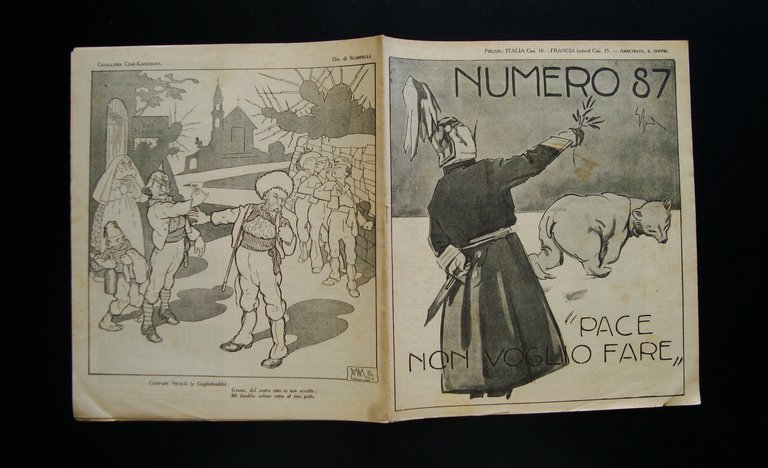 Settimanale umoristico illustrato, NUMERO 87" Anno III 22 Agosto 1915 Tip.Bona, Torino, 1915; cm 25x21,5, pp. nn (16) Belle illustrazioni in b/n nel testo e fuori testo di Sacchetti, Sto, Golia. Numero completo. Condizioni di conservazione Esemplare in buone condizioni con tracce d'uso e del tempo, brossura con bruniture e macchiette, margini con alcuni minimi strappetti. Numero completo. OPEB.3665 blu "