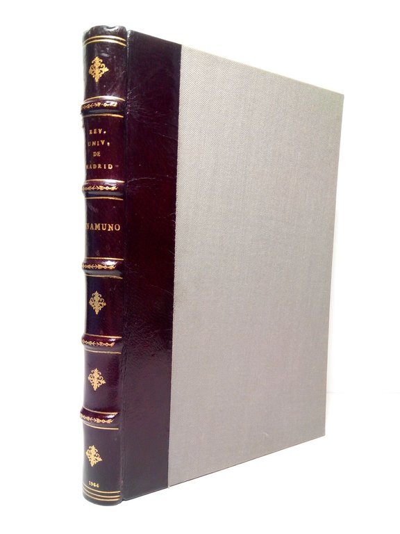 Madrid: Revista de la Universidad de Madrid [Edita], 1964.- 295 p., [1 h.]; 4º (23,5 x 16 cm); Fínamente encuadernado en Media Piel Nueva, lomo dorado, conserva la cubierta anterior original.- CONTIENE: Unamuno y elprofesor francés Jacques Chevalier, por M. García Blanco; Unamuno et les philosophes, por F. Meyer; La inseguridad ontológica, clavedel mundo unamuniano, por C. París; L'itineraire agonique d'Unamuno , por Alain Guy; Unamuno y el existencialismo de Soren Kierkegaard, por J. A. Collado; La relación sociedad-individuo, en Unamuno, por L. Gonzalez Seara; Teatro del alma, por Ricardo Gullón; Estructura y significado de "Niebla", por G. Ribbans; Camilo Castelo Branco frente a Eça de Queiros. Dos actitudes unamunianas, por J. Garcia Morejón; Algo sobre Unamuno y Rusia, por G. Aniama.* Excelente estado. LITERATURA Y FILOSOFÍA ESPAÑOLAS DE LOS SIGLOS XIX-XXI Y SU HISTORIA EN GENERAL
