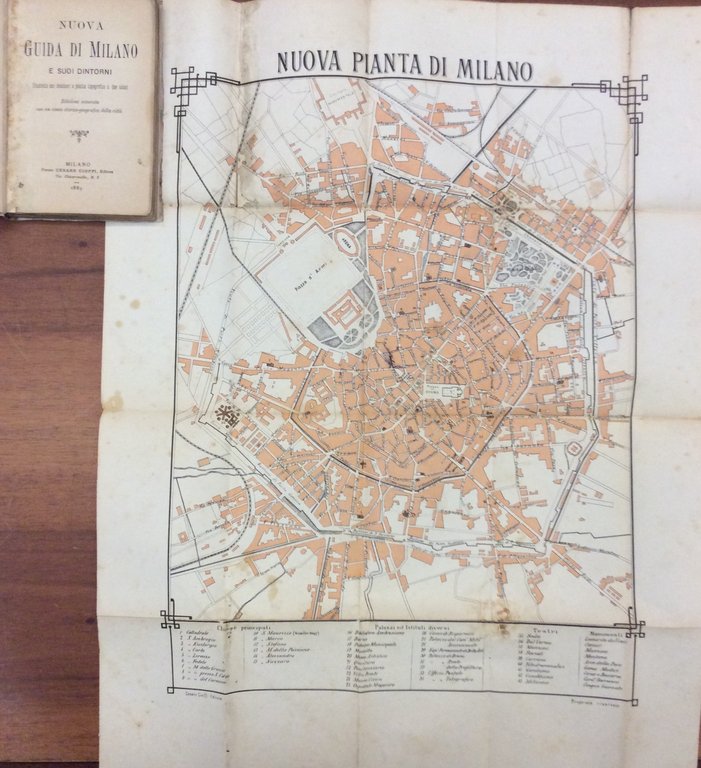 In-16 p. (mm. 157x103), brossura muta coeva, pp. 156,(8), con alcune incisioni su legno nel testo e una pianta topografica a colori di Milano, più volte ripiegata. La guida contiene indicazioni generali di utilità pratica: trasporti urbani, alberghi, caffè, ristoranti, teatri, musei, uffici pubblici e una descrizione degli edifici e monumenti notevoli lungo vari tragitti a partire da Piazza del Duomo.Cfr. L. Villa, Bibliografia delle Guide di Milano, scheda n. 313.Postillato con inchiostro su alcune pagine; occhietto rinforzato, pagine lievemente ingiallite per la qualità della carta, peraltro buon esemplare.