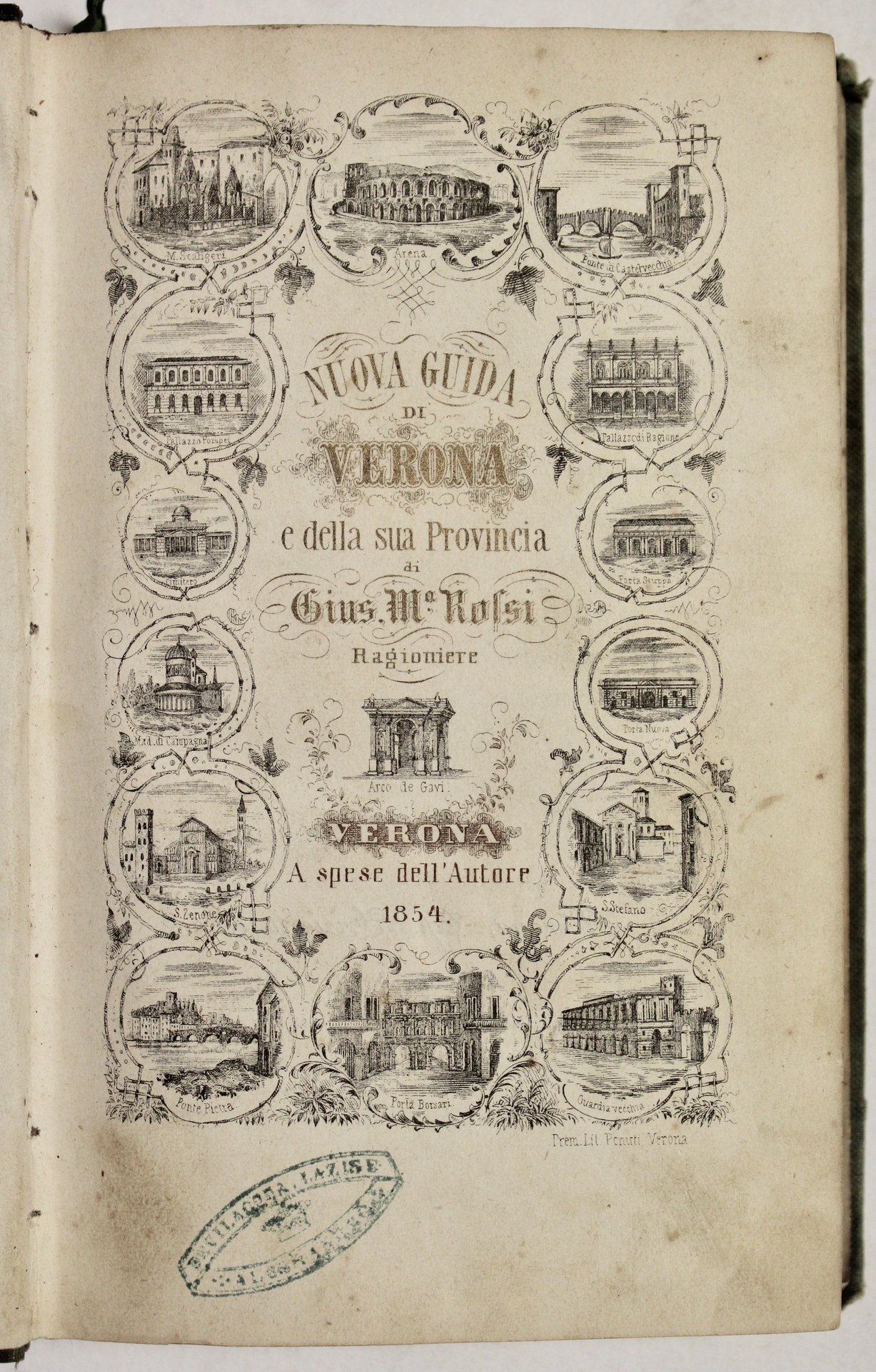 In 8°(mm 200x120), pagg. XIV, 335, 16. Frontespizio litografico eseguito da Penuti con 14 vedutine di Verona; tela editoriale coeva verde titolo e decori impressi in oro al dorso. Alla fine è aggiunta una pianta litografica di Verona di mm 460 x670, datata 1849 stampata a Rovigo da Minelli, normalmente inserita in Cagnoli "Cenni statistici di Verona e della sua provincia" ma non pertinente a questa opera, montata su tela in 24 stacchi. Buon esemplare con tracce d'uso alla tela aloni e piccole mancanze alle cuffie, internamente lievi fioriture. Piccolo timbro di collezione al frontespizio. <BR>