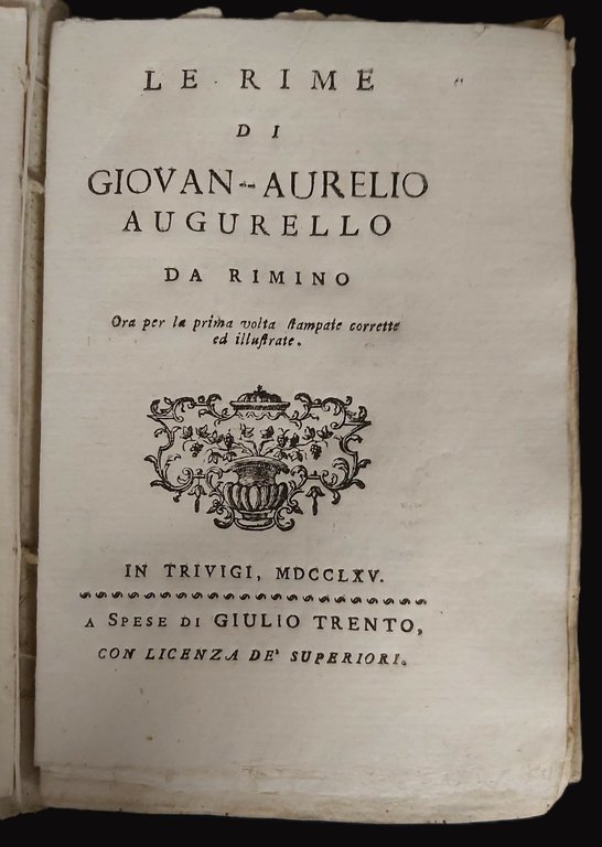 in-8, pp. (2), XV, 42, (2), 45, (2), 16, 12, 41, leg. cart. rust. coevo con tit. mss al d. Bella vignetta inc. in rame al front. Miscellanea di operette di cui: Rime di Giovan-Aurelio Augurello da Rimino, 1765; I Cesari di Giuliano Imperatore, 1764; Querele d'Aminta del Conte Palmerino Venzati scrittore del secolo XVI; L'Armonia, poemetto del P. Roberti della Compagnia di Gesù; Le Perle, poemetto di Giambattista Roberti della Compagnia di Gesù. Così nell'avviso al lettore: "Uscirà ciascuna operetta stampata separatamente; additando tuttavia l'ordine con cui si avranno a disporre per chi volesse ridurle in volumi". Alcune opere hanno front. autonomo, altre solo occhietto. Questa raccolta sul cui primo front. è indicato Volume primo costituisce il tentativo dello stampatore di dare origine ad una collana che dalle nostre ricerche bibliografiche si esaurisce in due soli tomi. Imp. soprattutto la presenza delle Rime del riminese Augurello (v. Gamba 1063) e delle Stanze del Venzati, per la prima volta pubblicate e di grande pregio letterario. 16/5