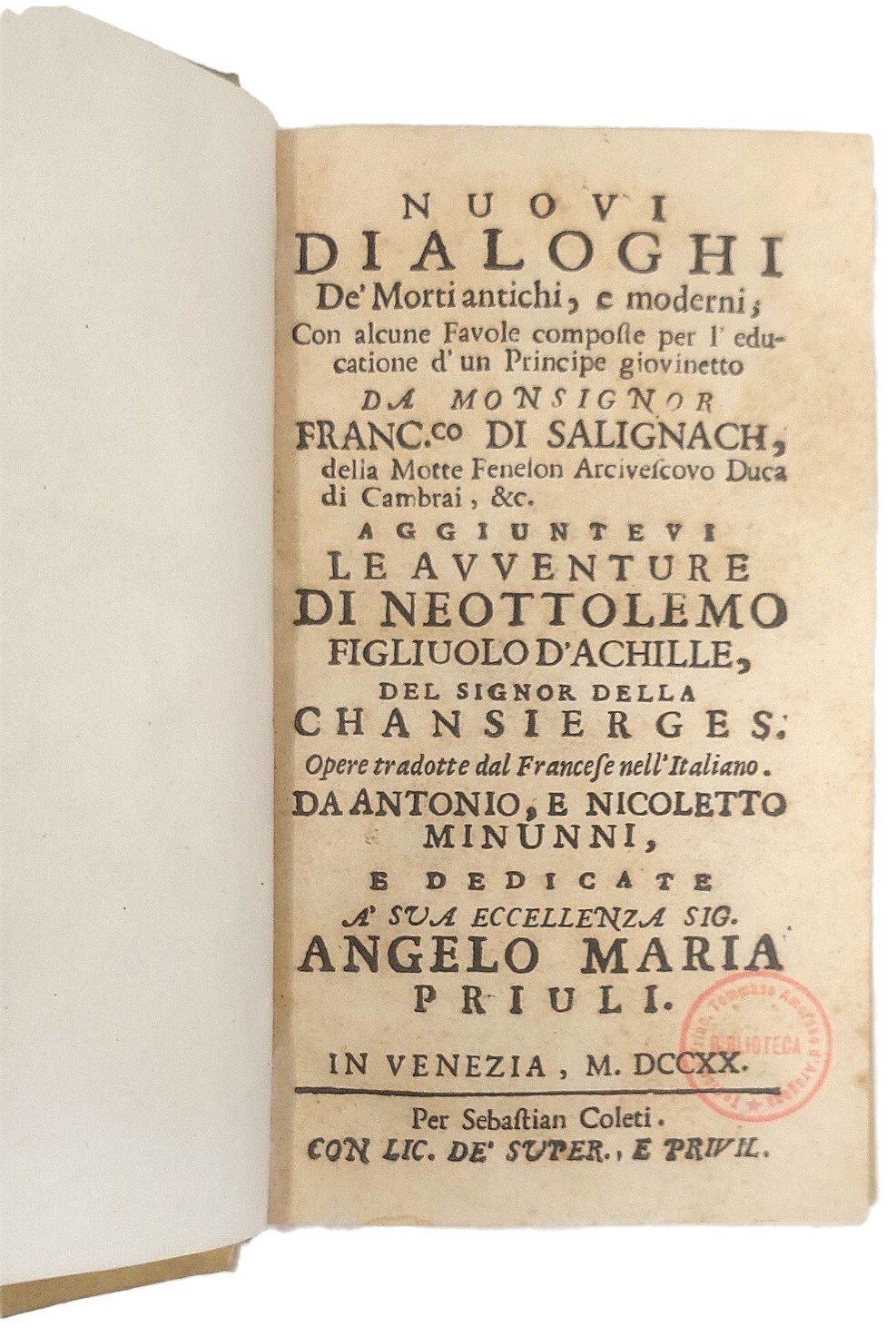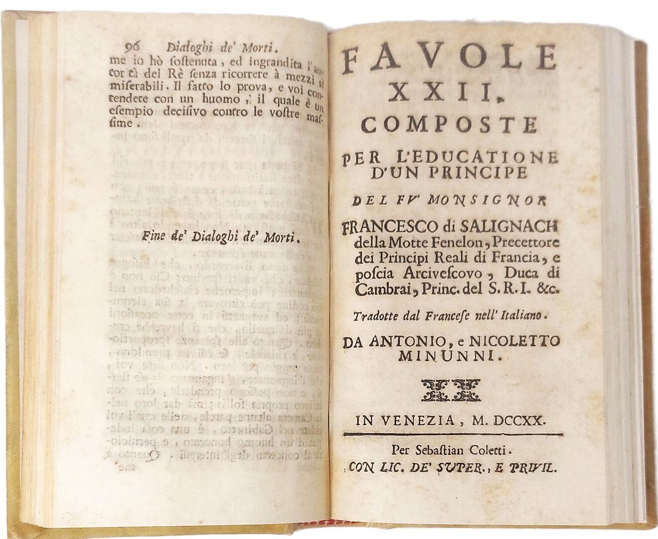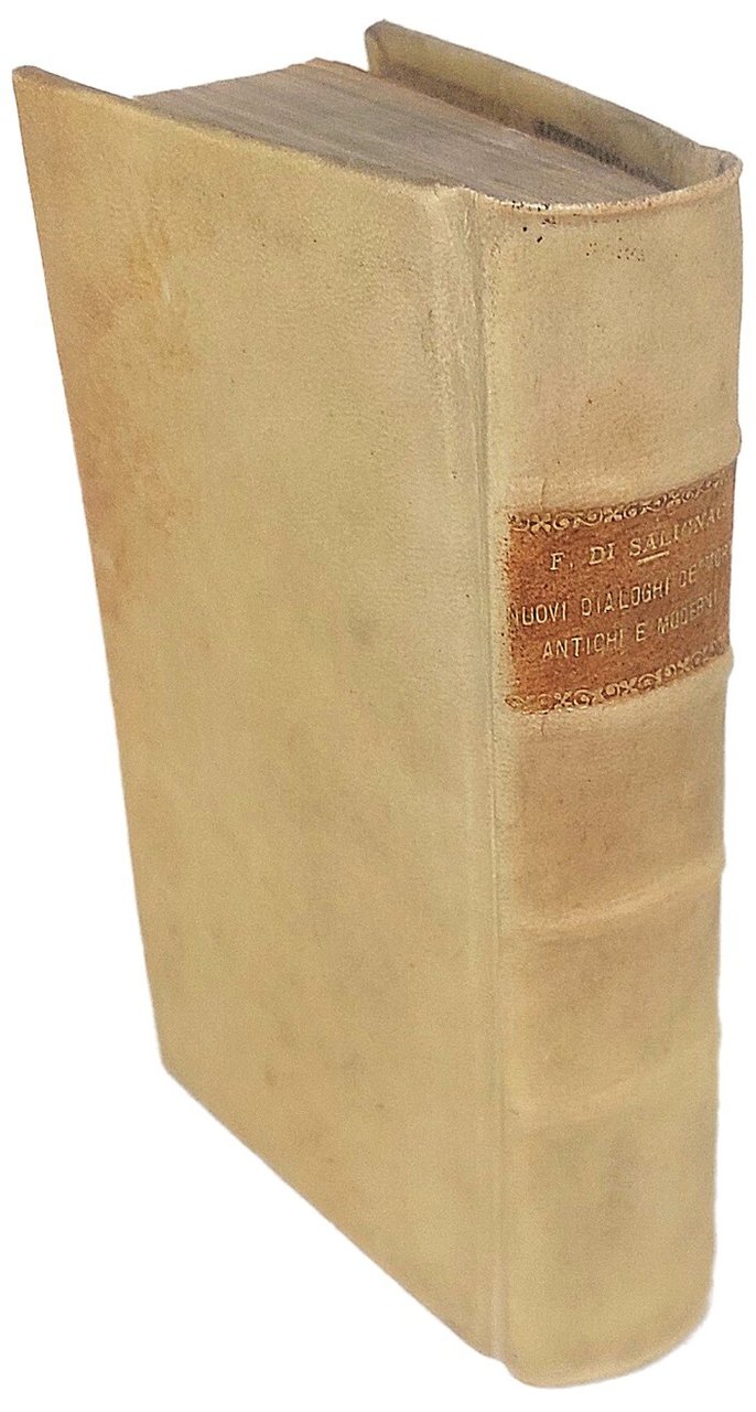 >in-16, 3 parti in un vol., pp. (14), 368, leg. 800esca in p. pergamena rigida, titolo in oro al dorso. Prima edizione italiana, tradotta da Antonio e Nicoletto Minunni dall'edizione più completa del ''Dialogues de morts anciens et modernes, avec quelques fable pour l'éducation d'un prince'' (Parigi, 1718). (François de Salignac de la Mothe, 1651 - 1715) fu scrittore e teologo francese, tutore del Duca di Borgogna prematuramente morto nel 1712. Fénelon prese a cuore il delicato incarico e scrisse diverse opere morali all'uopo, come ''Fables'', ''Dialogues des Morts'', ma soprattutto il ''Télémaque''. Nella presente opera sono raccolti: XX dialoghi, dedicati a celebri personaggi storici, XXII favole e infine ''Le avventure di Neottolemo'' del La Chausierges, una delle imitazioni del ''Télémaque'' che ebbero grande diffusione in Italia. Ottimo esemplare, proveniente dalla biblitoeca del Principe Pietro Amoroso di Aragona (ex libris al contropiatto e timbro al frontespizio). Graesse, II, 563 (solo edizione originale).