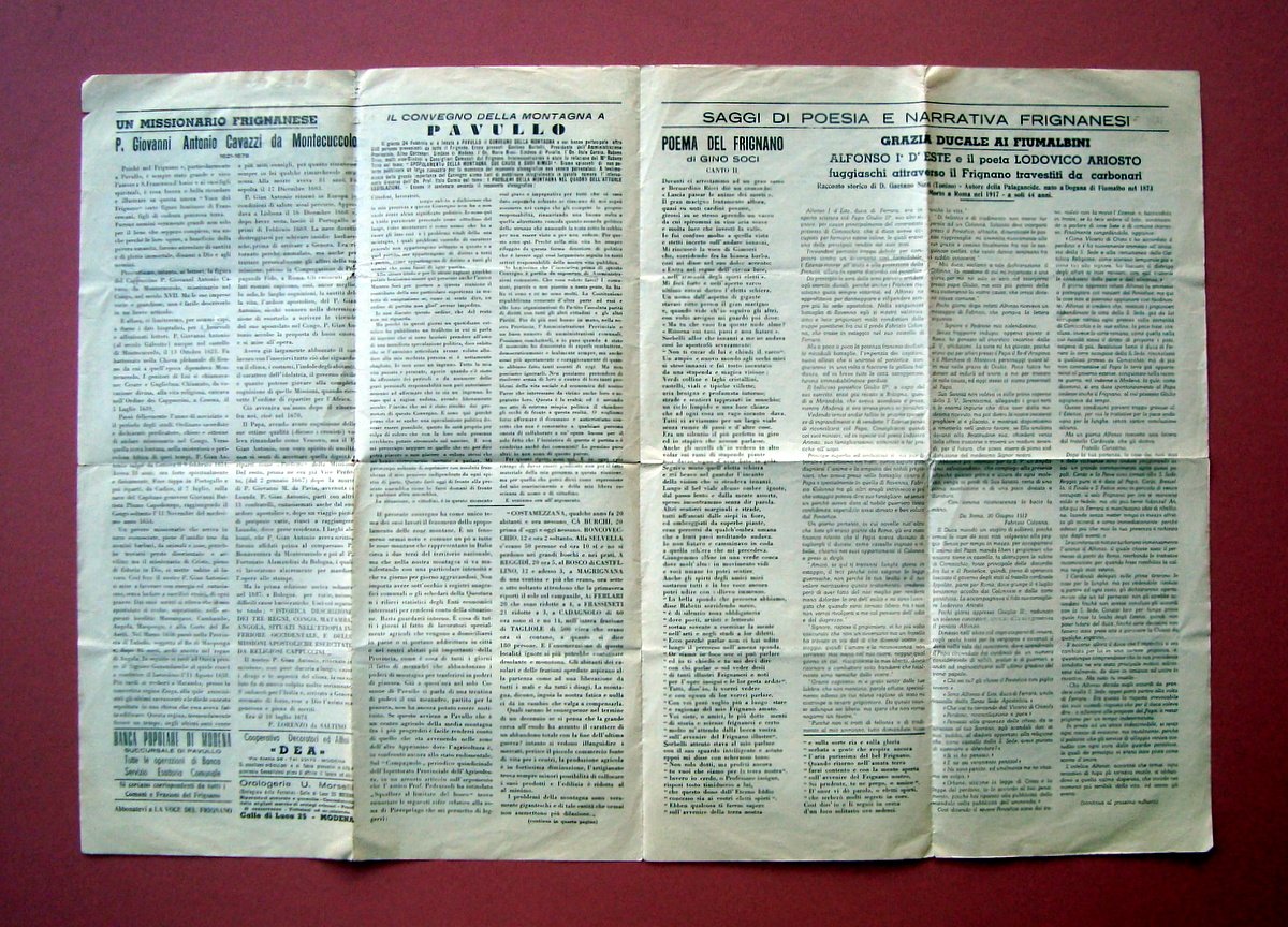 Periodico, La Voce del Frignano" Anno 1 N. 2 Febbraio 1955 in prima Il Nuovo Consiglio dell'Opera Pia Ospedale di Pavullo Modena, 1955; cm 44x32, pp. 4 (bifolio). Numero completo. Condizioni di conservazione Esemplare in buone condizioni con tracce d'uso, normali pieghe di conservazione, margini con bruniture e alcuni minimi strappetti, per le condizioni vedi foto. Numero completo. all'interno: P. Giovanni Antonio Cavazzi da Montecuccolo; Convegno della Montagna; Alfonso I° d'Este e Ludovico Ariosto fuggiaschi SC03.D19205 blu "