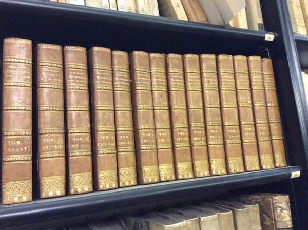 In-8 p. (mm. 225x148), 14 volumi, elegante legatura in mz. pelle coeva, dorso a cordoni con decoraz. e titolo oro, tagli azzurri. Offriamo il solo dizionario (completo), privo dei Supplementi e della parte iconografica. Prima traduzione italiana fatta da una società di dotti ed artisti, con l'aggiunta della spiegazione di tutte le voci proprie delle arti e dei mestieri italiani, di molte correzioni, scoperte e invenzioni estratte dalle migliori opere pubblicate recentemente su queste materie.Esempl. molto ben conservato.