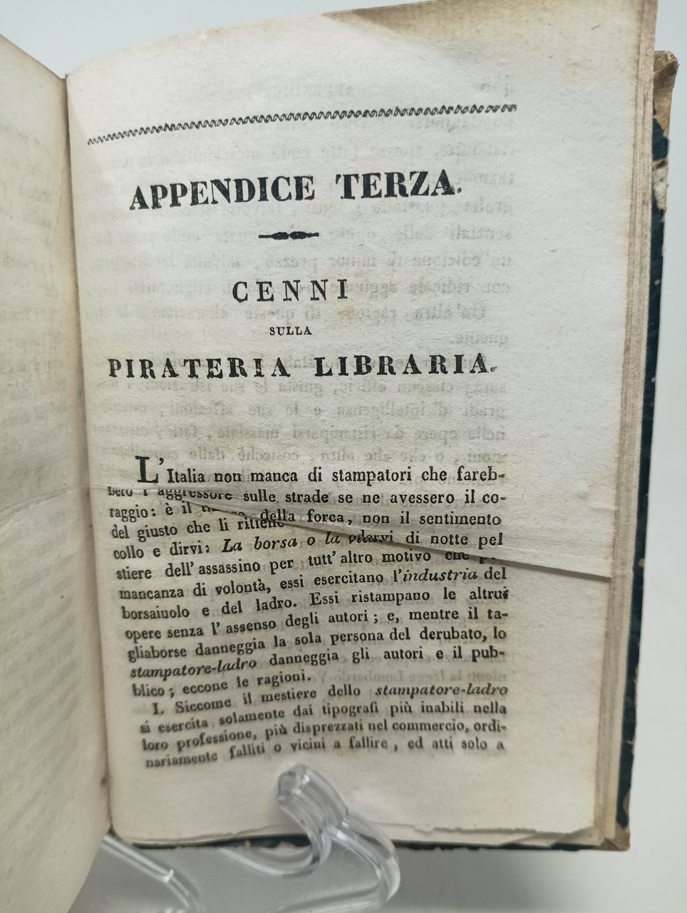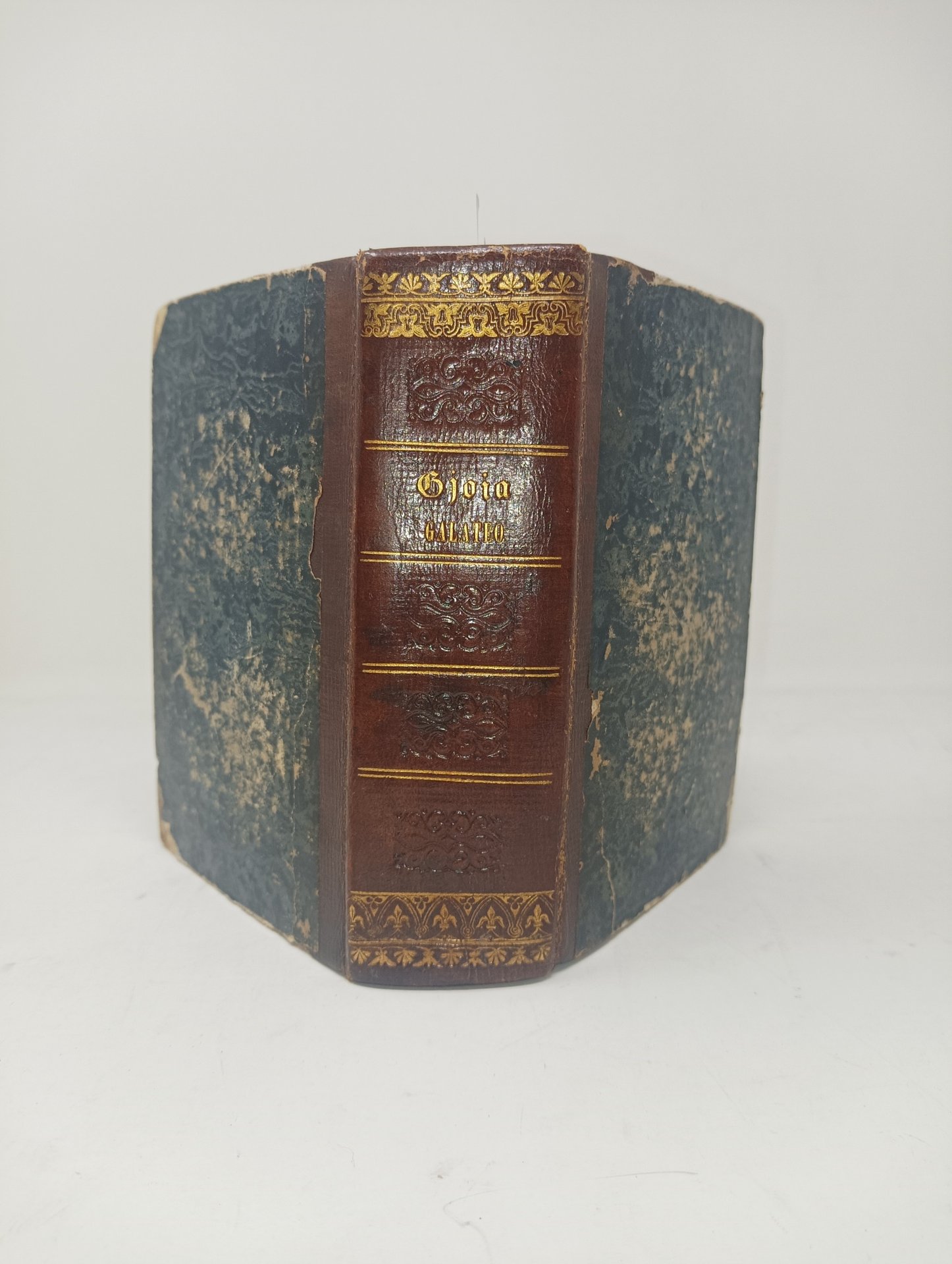>in-8 (mm 145x100), Tomo I: 344; Tomo II: 480 (alcune pag. del Tomo I sono state inserite nel Tomo II). Legatura in m. pelle marrone, titolo, autore e fregi in oro al dorso e incisioni a secco, piatti in carta decorata verde. "Nuova edizione, fatta sulla terza edizione di Milano". Il passaggio sociale e culturale dall'epoca delle Monarchie alle nuove idealità repubblicane porta ad un cambiamento delle norme sociali per la nuova età, rendendo il "Galateo" del Della Casa ormai non più attuale. Il Gioia risponde a questa esigenza con il suo "Nuovo galateo" in cui istruisce circa i comportamenti da tenersi nell'ambito privato e pubblico. Il tomo II comprende tre appendici, tra cui "Cenni sulla pirateria libraria": "Essi ristampano le altrui opere senza l'assenso degli autori; e, mentre il tagliaborse danneggia la sola persona del derubato, lo stampatore-ladro danneggia gli autori e il pubblico". Segni di usura ai piatti, qualche macchietta rossa. Ex libris in antiporta. Luisa Tasca, «Galatei.Buone maniere e cultura borghese nell'Italia dell'Ottocento», Firenze, Le Lettere, 2004: pag. 217