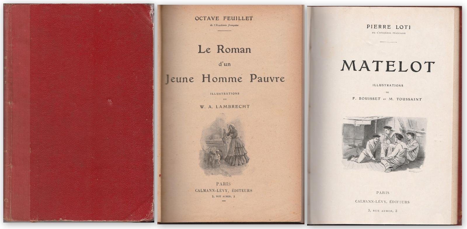 O. FEUILLET LE ROMAN D'UN JEUNE HOMME PAUVRE- PIERRE LOTI MATELOT 1914 L4927 COPERTINA RIGIDA IN SIMILPELLE ROSSA CON DORSO IN TELA CON TITOLO IN ORO, AI PIATTI, ANGOLI CON PIEGHE E SPELLATURE, DORSO CON ROTTURE RIPARATE, VOLUME CONTENENTE DUE RACCONTI, IL PRIMO DI O. FEUILLET LE ROMAN D'UN JEUNE HOMME PAUVRE CON NUMEROSE ILLUSTRAZIONI INTERCALATE NEL TESTO PAGINE LEGGERMENTE BRUNITE E ALLE ULTIME QUALCHE FIORITURA, IL SECONDO DI PIERRE LOTI MATELOT SU CARTA PATINATA ALCUNE PICCOLE MACCHIE AGLI ANGOLI DI QUALCHE PAGINA, QUALCHE PIEGA AGLI ANGOLI NUMEROSE ILLUSTRAZIONI, ENTRAMBE RACCONTI SONO IN FRANCESE E PROVENGONO DA NOUVELLE COLLECTION ILLUSTREE CALMANN-LEVY DEL 1914