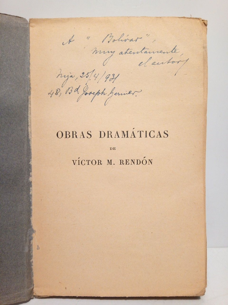 Paris: Librería Española, 1931.- TOMO II. con 226 p., [1 h.]; 8º (18,5 x11,8 cm); Intonso; Rústica Ed.- (Obras Dramáticas de Víctor M. Rendón. Tomo II).- RARO.* Con una dedicatoria autógrafa del autor en portadilla. Cubiertas ligeramente ajadas. Solo ofrecemos este Tomo 2º. Las Obras Dramáticas constaban de 5 Tomos (1927-1931). TEATRO Y CINE IBEROAMERICANOS