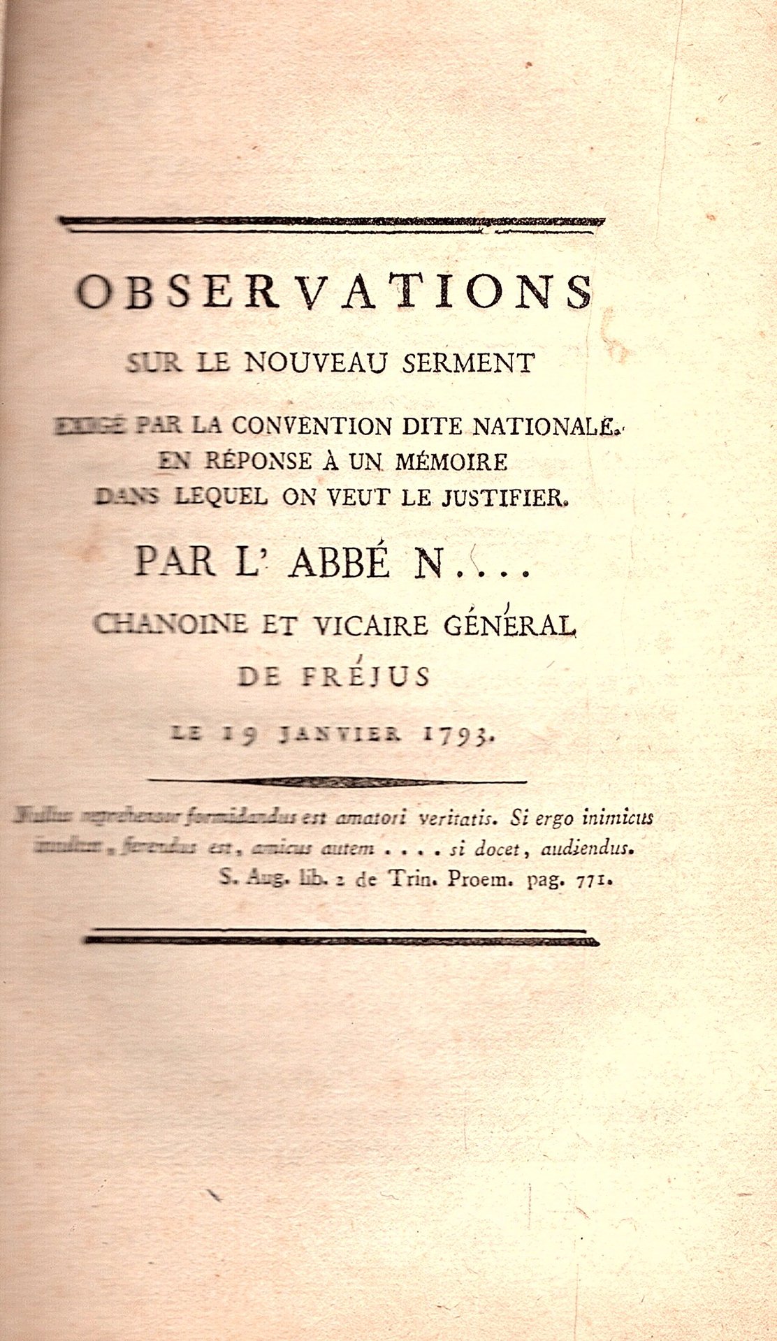 Observations sur le nouveau serment exigé par la Convention dite nationale en réponse à un mémoire dans lequel on veut le justifier. Par l'abbé N. chanoine et vicaire général de Fréjus le 19 janvier 1793