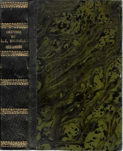 in 16°, pp. 6 nn., 491, 1; leg. coeva m/pelle verde con tit. e fregi in oro al ds., bella inc. in rame all'antip. Tomo undicesimo di "Oeuvres completes de J.J. Rousseau, nouvelle edition, conforme a celle de Geneve, 1782, et augmentée de quelques nouvelles Pieces". Bruciatura al margine inf. di 1 c., qc. fior. 491/23