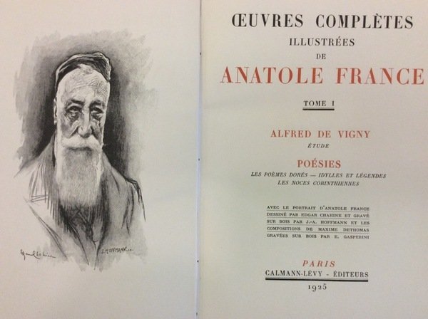 In-8 p., 25 volumi, bella legatura in mz. marocchino blu con ang., dorso a cordoni con titolo oro su due tasselli, taglio sup. dorato. Ogni volume è molto ben illustr. da inc. su legno nel testo L'opera è così composta: I) - "Alfred de Vigny", etude - "Poesies": Les poemes dores. Idylles et legendes. Les noces corinthiennes, pp. 429.<br>II) - "Jocaste et le chat maigre. - Le crime de Sylvestre Bonnard", pp. 513.<br>III) - "Les desirs de Jean Servien. - Le livre de mon ami", pp. 450. <br>IV) - "Nos enfants. - Balthasar", pp. 366. <br>V) - "Thais. - L'etui de nacre", pp. 498.<br>VI) - "La vie litteraire". Premiere serie, deuxieme serie, pp. 677.<br>VII) - "La vie litteraire". Troisieme serie, quatrieme serie, pp. 735.<br>VIII) - "La rotisserie de la reine pedauque. Les opinions de Jerome Coignard", pp. 523<br>IX) - "Le lys rouge. - Le jardin d'Epicure", pp. 545.<br>X) - "Le puits de Sainte Claire. - Pierre Noziere", pp. 527.<br>XI) - "Histoire contemporaine. L'orme du mail. Le mannequin d'osier", pp. 573.<br>XII) - "L'anneau d'amethyste. - Monsieur Bergeret a Paris". Histoire contemporaine, pp. 571.<br>XIII) - "Clio. - Histoire comique. - Sur la pierre blanche", pp. 570.<br>XIV) - "Crainquebille: Putois, Riquet et plusieurs autres recits profitables. - Crainquebille: comedie en trois tableaux. - Le mannequin d'osier: comedie enquatre actes. - Au petit bonheur: comedie en un acte", pp. 578.<br>XV) - "Vie de Jeanne d'Arc", vol. I, pp. 600.<br>XVI) - "Vie de Jeanne d'Arc", vol. II, pp. 480.<br>XVII) - "Rabelais. - Auguste Comte. - Pierre Lafitte", pp. 329. <br>XVIII) - "L'ile des pingouins. - La comedie de celui qui epousa une femme muette: comedie en deux actes", pp. 496.<br>XIX) - "Les contes de Jacques Tournebroche. - Les sept femmes de la Barbe-Blue", pp. 356.<br>XX) - "Les dieux ont soif", pp. 360. <br>XXI) - "Le genie latin. - Les poemes du souvenir", pp. 391.<br>XXII) - "La revolte des anges", pp. 332.<br> XXIII) - "Le petit Pierre. - La vie en fleur", pp. 601.<br>XXIV) - "Pages d'histoire et de litterature", vol. I, pp. 403.<br>XXV) - "Pages d'histoire et de litterature", vol. II, pp. 456,(2).<br>Collezione molto ben conservata, con barbe.