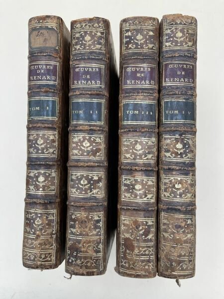 Imprimerie de Monsieur 1789 Imprimerie de Monsieur 1789, 4 volumes In-8 reliés pleine basane racinée, dos à nerfs très ornés, plats encadrés de triples filets dorés, tranches marbrées, gardes de papier marbré, pièces de titre rouges et de tomaison vertes. xxxvi + 407 + 557 + 515 + 456 pages suivi de 4 poages pour le privilège et l'approbation du Roi. Bien complet du portrait en frontispice du tome I par Rigaud gravé par Tarideu et des 7 gravures de Moreau et Marillier . Légers frottements aux reliures avec petits manques de cuir aux coiffes des tomes II et IV et trois petites épidermures. Etiquette ancienne en dos du tome I. Le corps des ouvrages est en très bon état, les gravures de belle qualité. Précisons que 2 volumes complémentaires destinés au théatre italien et tirés à petit nombre complétaient l'oeuvre initialement, ils ne figurent pas ici comme dans la plupart des séries (Bibliographie Cohen). Très bon ensemble