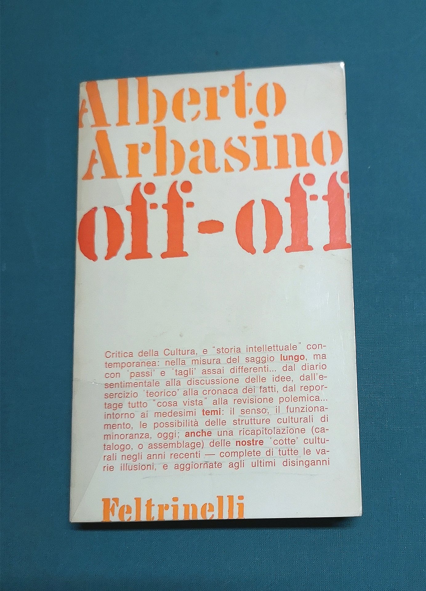 >in-8, pp. 296, brossura. Edizione originale di raccolta di saggi di critica della cultura. Fa parte della raccolta ''Materiali 16''. Buon esemplare, rare sottolineature a lapis. Gambetti-Vezzosi, Rarità bibliografiche del Novecento italiano, p. 31.