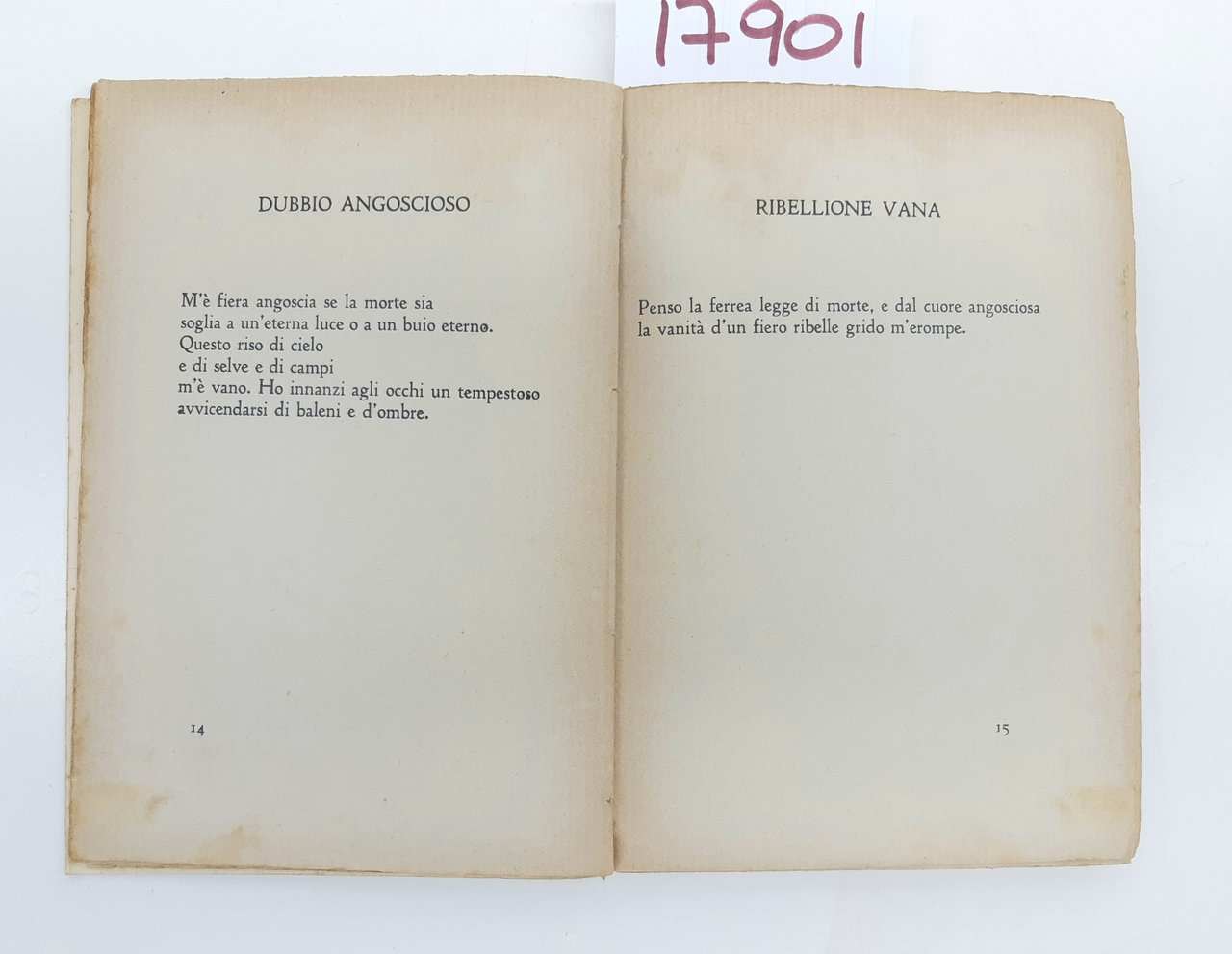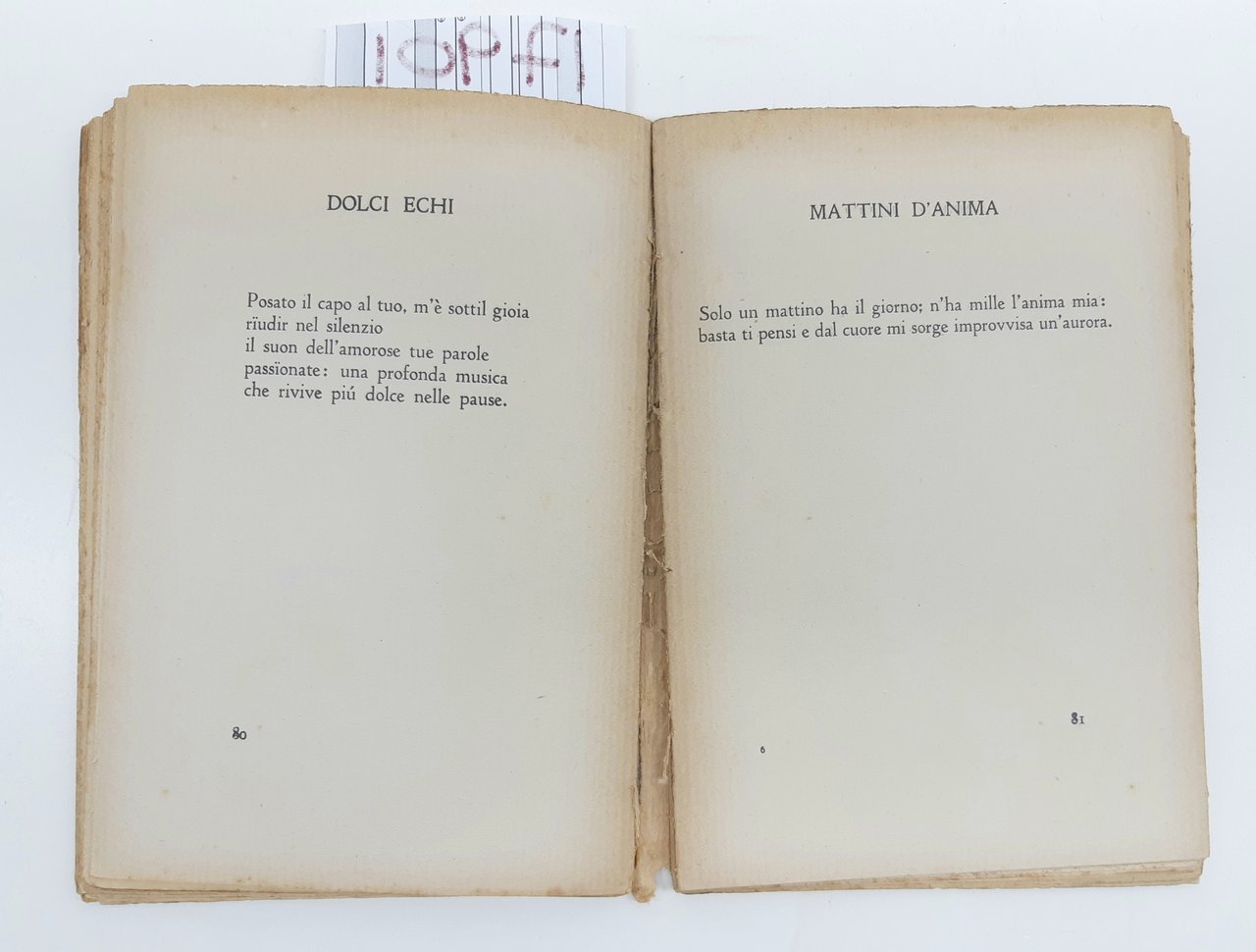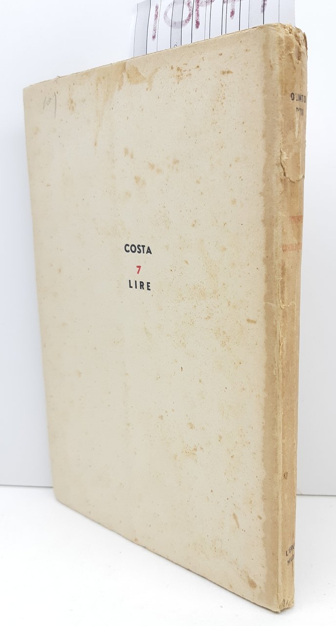 Legatura morbida editoriale in condizioni accettabili con fioriture e bruniture diffuse ai piatti e al dorso, dorso con uno strappo riparato al margine superiore ed abrasioni ai margini, tagli irregolari bruniti con fioriture, manca la prima pagina, interno in precarie condizioni, libro quasi diviso in due a pag. 80, fioriture alle pagine interne che non vanno a disturbare la lettura, brunitura al margine esterno delle pagine, numero pagine 136 + indice dimensioni cm 19,2 * 13,5