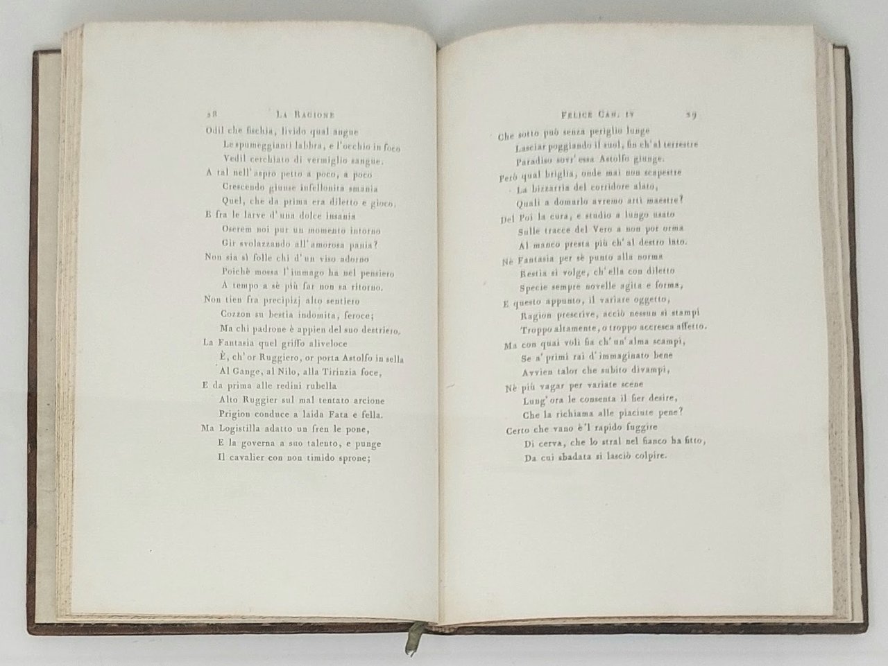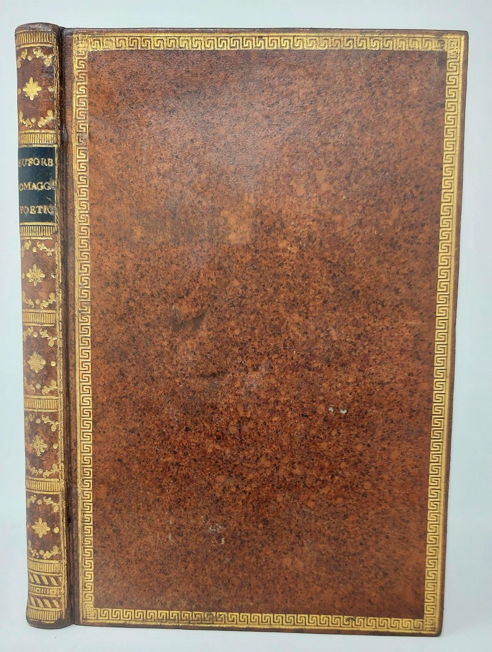 >2 parti in un vol. in-8 (213x142 mm), pp. (4), 84, (12, L'Apoteosi di Verter); leg. coeva p. pelle marmorizz., bordura oro ai piatti, tit. oro su tassello in pelle blu e fregi al dorso, tagli screziati. Vignetta incisa in rame al titolo, 4 ff. in fine con iscrizioni in carattere greco, ebraico, italiano e latino. L'opera si conclude con l'apoteosi del cagnolino Verter, cui è dedicata l'iscrizione. Sotto lo pseudonimo di Euforbo Melesigenio (nome pastorale), si cela l'autore, l'abate Tommaso Valperga di Caluso dei Conti di Masino. Deliziosa edizione Bodoni a tiratura limitata; bell' esemplare in carta grande di Londra, a pieni margini., con ex-libris cardinalizio. Brooks 458: "Libro molto grazioso con fleuron sul titolo. Ne furono tirate 10 copie in carta d'Annonay ed alcune in carta di Londra". De Lama, II, 74.