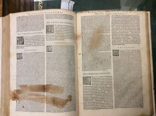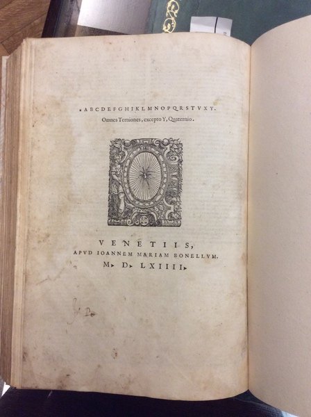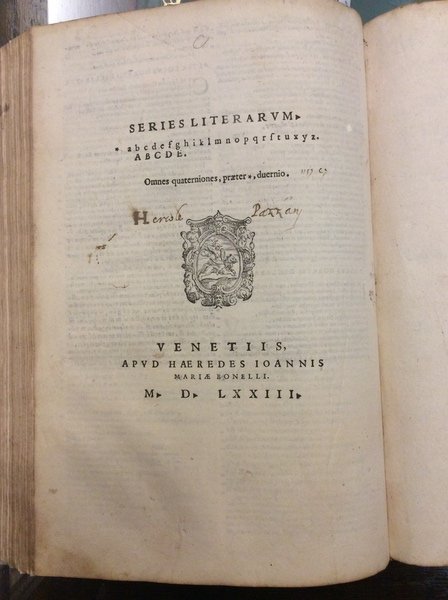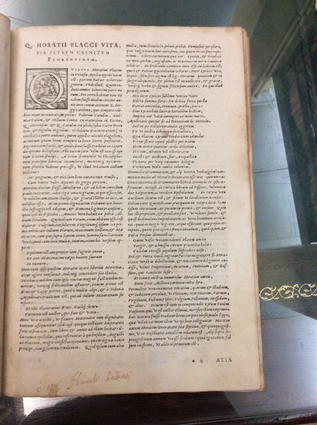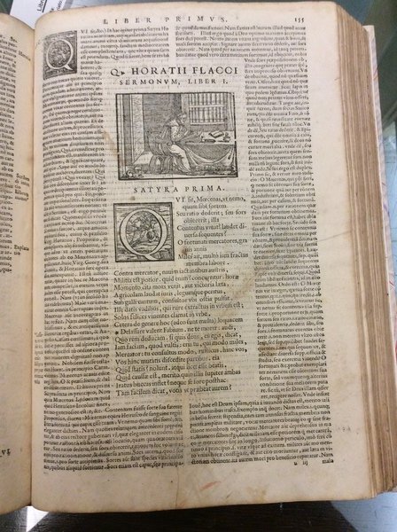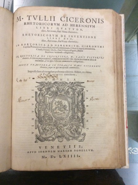 In-4 p. (mm. 290x200), mz. pergamena mod., filetti e titolo oro al dorso, 4 cc.nn., 221 (ma 223) cc.num., 1 c.b., marca tipografica xilografata al frontespizio e in fine, ornato da bei grandi capilettera figurati a vignetta, testo su due colonne, circondato dal commento. All'inizio di ciascun libro (11 volte) il ritratto del poeta con corona d'alloro, nell'atto di scrivere nel suo studio.Cfr. Choix de Olschki,IV,4682 per un'ediz. sempre del Bonelli, 1562 - Brunet,III,314 per la prima ediz. di Venezia, Scoto, 1544 con questi commenti e le ristampe del Bonelli a partire dal 1559.Unita un'opera di CICERONE:- "Rhetoricorum ad Herennium Libri quatuor" alias Ars Nova, sive Nova rethorica - "Rethoricorum de Inventione Libri duo" alias Ars vetus, seu Vetus rhetorica. Impressa sunt ad exemplum postrema editionis Aldinae, ex ultima Pauli Manutii correctione. Venetiis, apud I.M. Bonellum, 1564, di cc.nn. 6, cc.num. 133 (manca l'ultima c.b.), marca tipografica xilografata al frontespizio e in fine, ornato da bei grandi capilettera figurati a vignetta.L'opera porta commenti e annnotazioni di numerosi autori: H. Capiduri Parentini & J. Badij, G. Longolij, C. Pontani, etc. (x la prima) - M.F. Victorini, D. Hieronymi, M. Becichemi (x la seconda).Entrambe le opere con macchie o aloni interc. nel testo, ma complessivam. discreti esemplari.