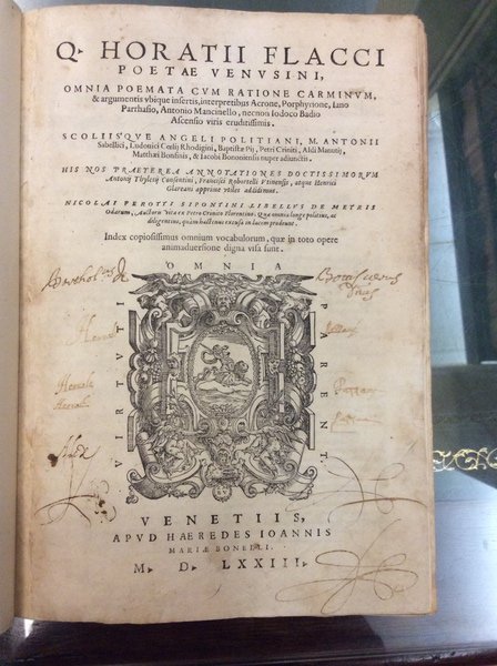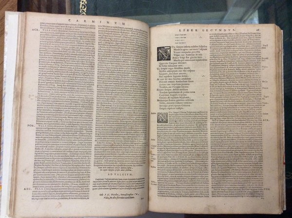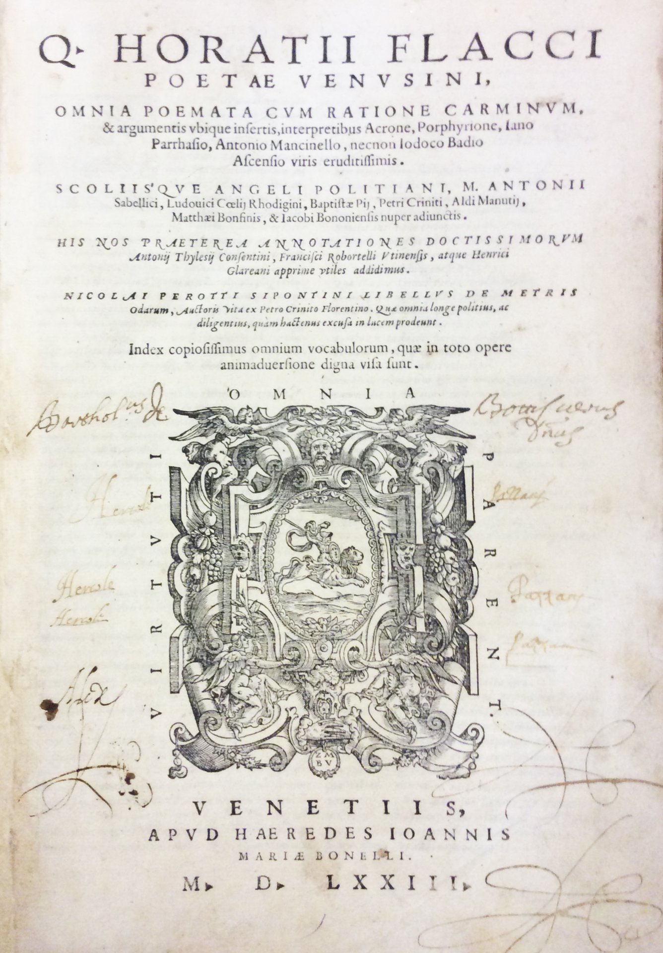OMNIA POEMATA. - Cum ratione carminum... interpret. Acrone, Porphyrione, Jano Parrhasio, Ant. Mancinello, necnon Jod. Badio Ascensio, scholiisque Angeli Politiani, Sabellici etc., Praeterea annotat. Ant. Thylesii, Fr. Robortelli atque H. Glareani : Nic. Perotti libellus de metris odarum, etc.