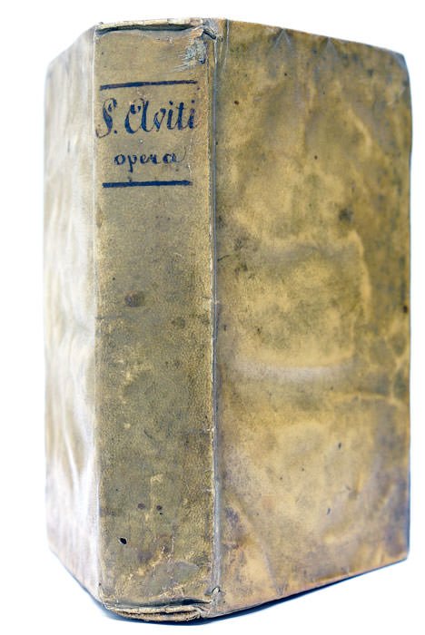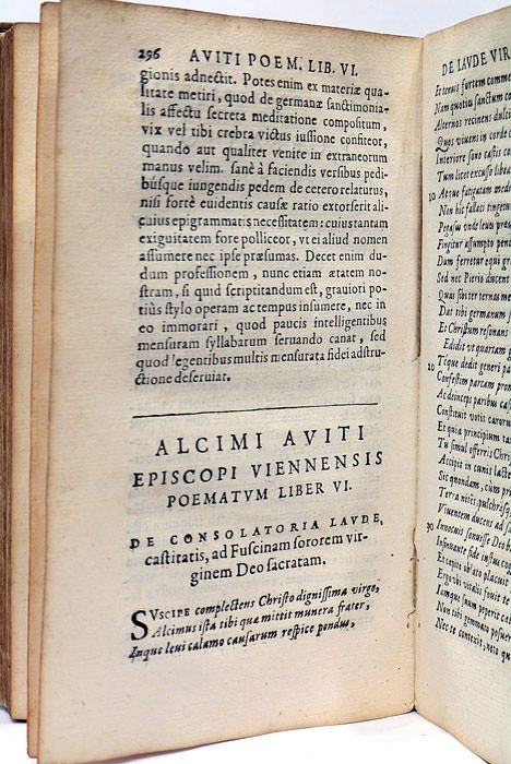 8 feuillets. 317 pages. 4 feuillets. 64 pages. (17,5x11 Cm). Parchemin souple de l'époque. Titre manuscrit au dos. Dos partiellement décollé. Edition Collective des œuvres d'Avitus, plus connu sous le nom de Saint Avit. Avitus était d'une illustre famille d'Auvergne et fut évêque de Vienne en Dauphiné et l'un des chefs les plus influents du clergé des Gaules. Son œuvre littéraire se compose de lettres, d'homélies et surtout de poèmes. Cette édition a été préparée, avec des notes, par le jésuite auvergnat Jacques Sirmond. Rousseurs et taches éparses. Quelques mouillures claires. Petites traces de ver. Cinq cahiers partiellement déreliés.