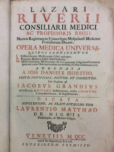 In-4 p. (mm. 327x220), cartonato muto mod. stile Settecento, pp. (12),590 (mal numer. ma vol. completo),(30). L'opera comprende: I. Institutionum Medicarum. Libri Quinque - II. Praxeos Medicae. Libri Septemdecim - III. Observationum Medicarum & Curationum insignium Centuriae quatuor, cum Observationibus rarioribus, ab alijs communicatis. Accesserunt in Riverii Institutiones, utiles Anonymi Animadversiones & Supplementa. La sua "Praxis Medica" è una delle opere importanti dell'epoca. Cfr. Morton,2727 che cita l'ediz. di Francoforte, 1674: "Riverius was the first to note aortic stenosis" - Olschki,VII,9415: "Riverius introduisa le premier la méthode spagirique de Paracelse dans l'université de Montpellier" - Eloy,IV,288: "Lazare Rivière (1589-1655), Medico Consigliere del Re, fu Decano dei Professori di Medicina della Regia Università di Montpellier".Con uniformi arross. più o meno pesanti su alc. cc., aloni margin. interc. nel testo.