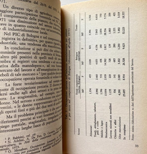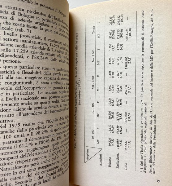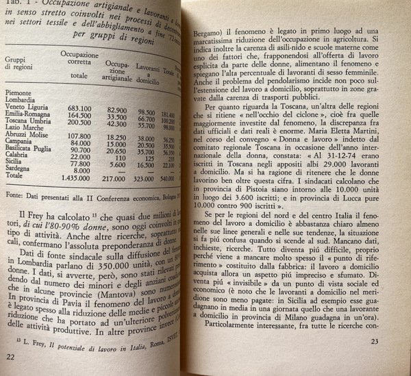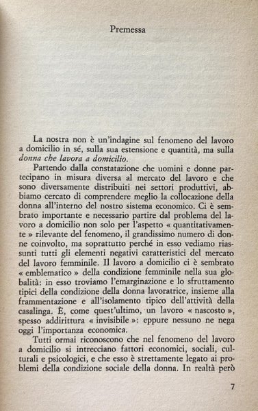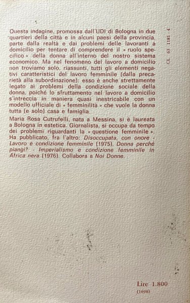 Soggetti: Donna, Lavoro a domicilio, Economia, Donne lavoratrici, Operaie, Fabbriche, Sindacati, Cottimo, Occupazione, Disoccupazione, Sociologia, Indagini, Inchieste, Diritti sociali, Documenti, Dati, Italia, Anni Sessanta, Anni Settanta, Lavoro femminile, Tipologia, Salario, Stipendio, Differenze di genere, Mamme, Figli, Famiglia, Ferie, Uomini, Retribuzione salariale, Ruoli, Sud, Nord, Femminismo, Politica economica, Leggi, Governo, Garanzie, Reddito, Produttività, Lavorare da casa, Saggi, Libri Vintage Fuori catalogo, Home Labor, Nero, Economia sommersa, Operai, Specializzazione, Lavoro a mano, Bisogni, Privato, Collettivo, Lotta politica, Manifestazioni, Rappresentanza, Partiti politici, Difesa, Diritto, Norme, Sfruttamento, Schiavitù, Professioni, Scuola, Scolarizzazione, Biondi, Bottazzi, Calza, Bini, Vinay, Riconversione, Mercato, Capitalismo, Controllo, Regolamenti, Tessile, Classe operaia, Marxismo, Previdenza, INPS, Pensione, Contributi, Sinistra, PCI, Organizzazione, Società, Patronato, Aziende, Committenti, Cucire, Calzaturiero, Abbigliamento, Lavanderia, Commercio, Pelletteria, Pelli, Lavorazione manuale, Albo professionale, Metalmeccanici, Giocattoli, Decentramento, Emilia Romagna, Bologna, Tensioni familiari, Problemi sociali, Lavoranti, Clandestinità, UDI, Maternità, Allattamento, Servizi sociali, Domicilio, Bibliografia, Riferimento, Collezionismo, Condizioni economiche, Tempo pieno, Contratti, Part-time, Agricoltura, Terziario, Frey, Toscana, Sicilia, Veneto, Liguria, Calabria, Basilicata, Puglia, Molise, Campania, Abruzzo, Sardegna, Lazio, Marche, Piemonte, Lombardia, Cifre ufficiali, Piccole imprese, Collaborazione, FULTA, Maglieria, Macchine cucitrici, Minuteria, Artigianato, Calzature, Scarpe, Pellami, Cuoio, Legno, Casalinghe, Giornalismo, Reportage, Condizione femminile, Emancipazione, CGIL, Woman, Home work, Economy, Working women, Workers, Factories, Unions, Cooking, Employment, Unemployment, Sociology, Investigations, Inquiries, Social rights, Documents, Data, Italy, Sixties, Seventies, Female work, Typology, Salary, Salary, Gender differences, Mothers, Children, Family, Holidays, Men, Salary wages, Roles, South, North, Feminism, Economic policy, Laws, Government, Guarantees, Income, Productivity, Working from home, Essays, Out of print books, Underground economy, Workers, Specialization, Hand work, Needs, Private, Collective, Political struggle, Demonstrations, Representation, Political parties, Defense, Law, Norms, Exploitation, Slavery, Professions, School, Schooling, Reconversion, Market, Capitalism, Control, Regulations, Textiles, Working class, Pensions, Contributions, Left, Organization, Society, Patronage, Companies, Clients, Sewing, Footwear, Clothing, Laundry, Commerce, Leather goods, Skins, Manual workmanship, Professional register, Metalworkers, Toys, Decentralization, Family tensions, Social problems, Workers, Secretity, Maternity, Lactation, Social services, Domicile, Bibliography, Reference, Collecting, Economic conditions, Full time, Contracts-time, Agriculture, Tertiary sector, Official figures, Small business, Collaboration, Knitwear, Sewing machines, Small parts, Handicraft, Footwear, Shoes, Hides, Leather, Wood, Housewives, Journalism, Female condition, Emancipation