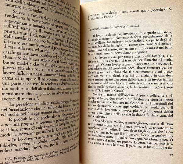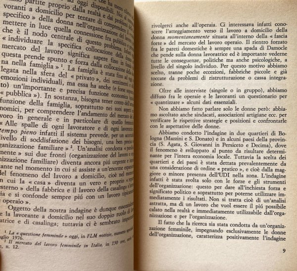 Questa indagine, promossa dall'UDI di Bologna in due quartieri della città e in alcuni paesi della provincia, parte dalla realtà e dai problemi delle lavoranti a domicilio per tentare di comprendere il ruolo specifico della donna all'interno del nostro sistema economico. Ma nel fenomeno del lavoro a domicilio non troviamo solo, riassunti, tutti gli elementi negativi caratteristici del: lavoro femminile (dalla precarietà alla subordinazione): esso è anche strettamente legato ai problemi della condizione sociale della donna; poiché lo sfruttamento nel lavoro a domicilio s'intreccia in maniera quasi inestricabile con un modello ufficiale di «femminilità» che vuole la donna tutta (e solo) casa e famiglia.