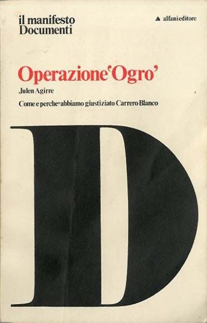 208 p., : ill. ; 21 x 14 cm. Il manifesto. Documenti, 1. 20 dicembre 1973. In pieno centro di Madrid una carica di dinamite fa saltare l'auto dell'ammiraglio Carrero Blanco, il delfino del dittatore Francisco Franco. L'«Operazione Ogro» viene rivendicata dall'organizzazione indipendentista rivoluzionaria basca ETA. Questo libro affronta le questioni poste dall'«operazione». Parlano i membri del commando che ha giustiziato l'«Ogro». L'introduzione di Maximo (pseudonimo di un dirigente politico spagnolo) ne dà un'inquadratura politica. Traduzione di Marilena Feldbauer. Brossura editoriale, coperta in cartoncino flessibile con titolo impresso al piatto e al dorso. Qualche segno del tempo, alcune sottolineature, per il resto esemplare integro. Codice libreria 9087.
