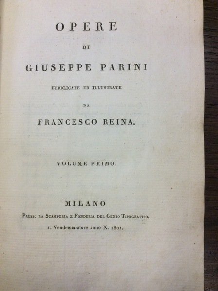 In-8 p. (mm. 228x154), 6 volumi, mz. pelle coeva (lievi abras.), titolo oro al dorso su due tasselli, pp. LXVIII,240; VII,262; VI,320; (8),246,(2); (4),252; (6),251,(9); con un bel ritratto del Parini, inc. in rame dal Rosaspina (con fiorit.). "Prima edizione delle opere" in cui è contenuta anche la "prima edizione del Giorno". Cfr. Parenti,389 - Gamba,2637: "Raccolta la piu' copiosa, fatta per cura di Francesco Reina, discepolo dell'Autore e scrittore della sua "Vita"" - Brunet,IV,370 - Cat. Hoepli,278: "L'edizione fu pubblicata per sottoscrizione; nell'elenco degli abbonati posto in fine al V e VI vol. si trovano i nomi dei piu' eminenti personaggi dell'epoca come: Napoleone, Albertolli, Appiani, Bossi, Ugo Foscolo, Alessandro Manzoni, Vincenzo Monti, il Ministro Prina, Francesco Rosaspina, etc. etc." - Bustico,1: "Se ne tirarono 40 copie in carta forte".Solo vol. IV con lieve alone su ca. 10 cc.; 1 carta iniziale del vol. V restaur. per picc. mancanza margin., altrimenti fresco esemplare "su carta forte", ben conservato.