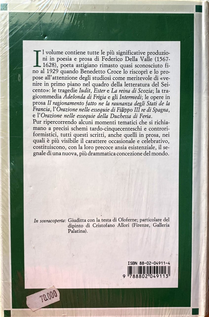 Il volume contiene tutte le più significative produzioni in poesia e prosa di Federico Della Valle (1567-1628) poeta astigiano rimasto quasi sconosciuto fino al 1929 quando Benedetto Croce lo riscoprì e lo propose all'attenzione degli studiosi come meritevole di «venire in primo piano nel quadro della letteratura del Seicento»: le tragedie Iudit, Ester e La reina di Scozia; la tragicommedia Adelonda di Frigia e gli Intermedi; le opere in prosa Il ragionamento fatto ne la raunanza degli Stati de la Francia, l'Orazione nelle essequie di Filippo III re di Spagna, e l'Orazione nelle essequie della Duchessa di Feria. Pur ripercorrendo alcuni momenti tematici che si richiamano a precisi schemi tardo-cinquecenteschi e controriformistici, tutti questi scritti, anche quelli in prosa, nei quali è più visibile il carattere occasionale e celebrativo, costituiscono, con la loro precoce ansia esistenziale, il segnale di una nuova, più drammatica concezione del mondo. In sovraccoperta: Giuditta con la testa di Oloferne; particolare del dipinto di Cristofano Allori (Firenze, Galleria Palatina).