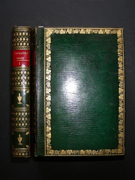 2 voll. in-8, pp. LVI, 312, (2), 1; XII, 313, magnifica leg. marocchino verde coeva con tass., tit. e ricchi fregi oro ai d., cornici in oro ai piatti, dentelles, tagli dorati. Risguardi in carta dec. Ritr. dell'A. inc. in rame in antip. Bella vignetta in rame su ciascun front. con allegorie. Con una tav. al fine del primo vol. Nel secondo vol. precede la dedicat. una incis. in rame con le armi di Guidubaldo della Rovere. Pittore e architetto marchigiano (Pesaro 1710-1801) affiancò alla sua attività di artista quella di teorico dell'arte le cui dissertazioni sono raccolte in questa edizione postuma delle Opere, curata dallo stesso editore Gavelli. Si apre con la biografia del L., segue l'elenco delle sue opere pittoriche e architettoniche, e i vari trattati. Il secondo vol. contiene il Catalogo delle pitture di Pesaro. Manca a Lozzi. Hoepli 6456: "Raro". Splendido esempl. in elegante legatura. [MM21-371]