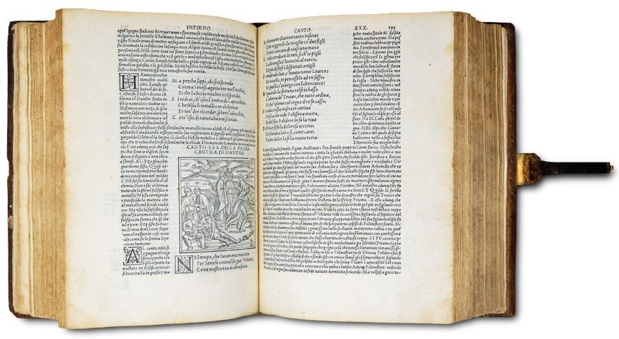 Edizione di notevole eleganza grafica, esemplare su carta forte e spessa in ottime condizioni (all'ultimo f. porzione del margine interno e strappo orizzontale con abili restauri che toccano poche lettere, ruga della carta all'estremo margine di c1, 4 ff. anticamente rimarginati lungo l'estremo margine inferiore: dd1,2,7,8; forellino di tarlo al margine interno inferiore di alcuni fogli). Nota ms. in fine, al verso del colophon: "Dal paradiso terrestre..." A proposito dei legni, cfr. Mortimer, Harvard It., 144: "This is the first appearance of this set, and the degree of its dependence on the 1491 illustrations varies with the different block cutters. The blocks begin in the same size as the March 1491 cuts but differ in details. "P.F." cut the first of the smaller blocks for canto xvii of the "Inferno" and from there on, sizes and styles are mixed and some cutters work clearly from the 1491 scenes". Sander, 2320. Mambelli, 23. Essling, 536. De Batines I, 52-54: "Edizione rara e accreditata…". Sincero, Trino e i suoi tipografi, p.176. Bacchi della Lega p.39. Pillinini, B.Stagnino, un editore a Venezia, p.92.